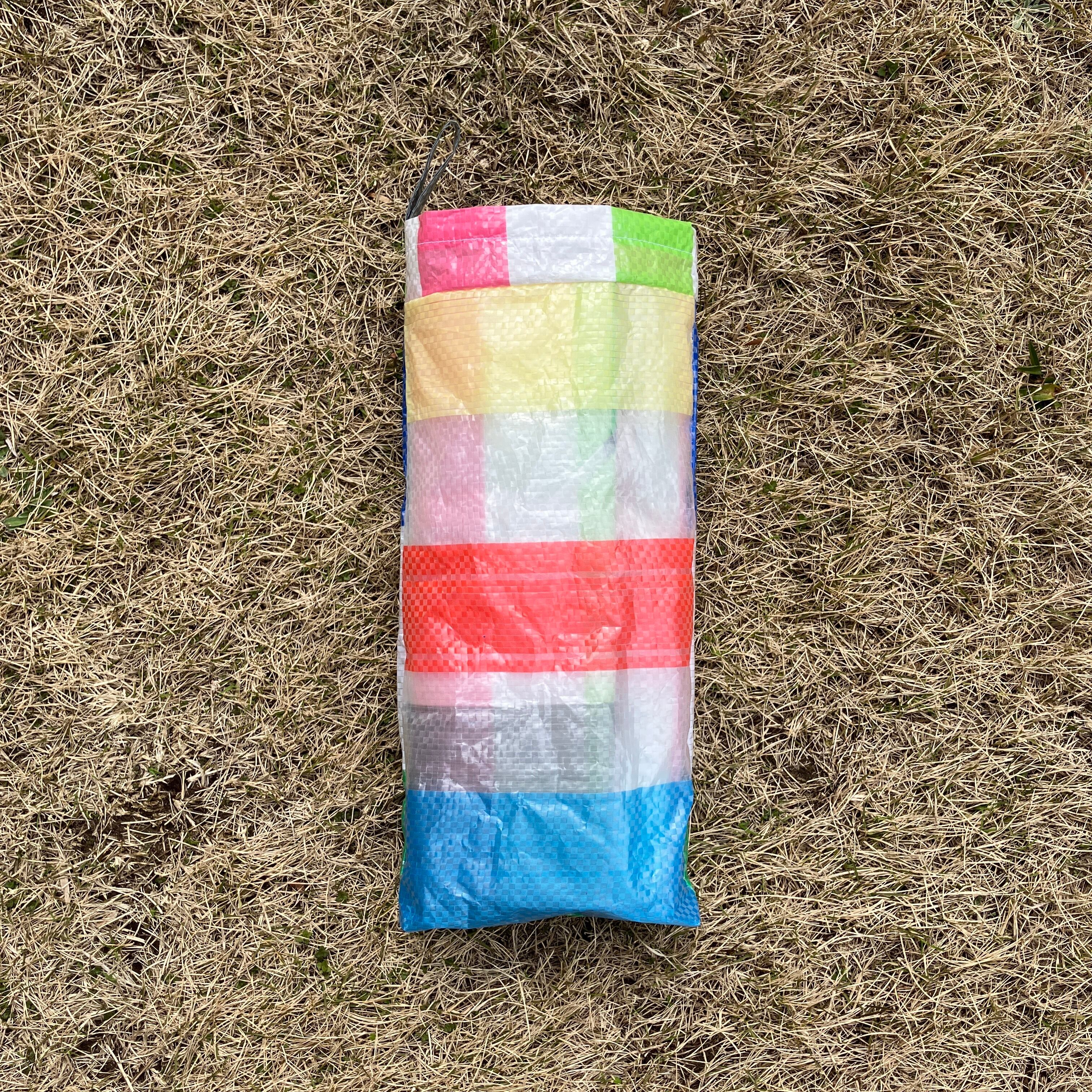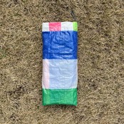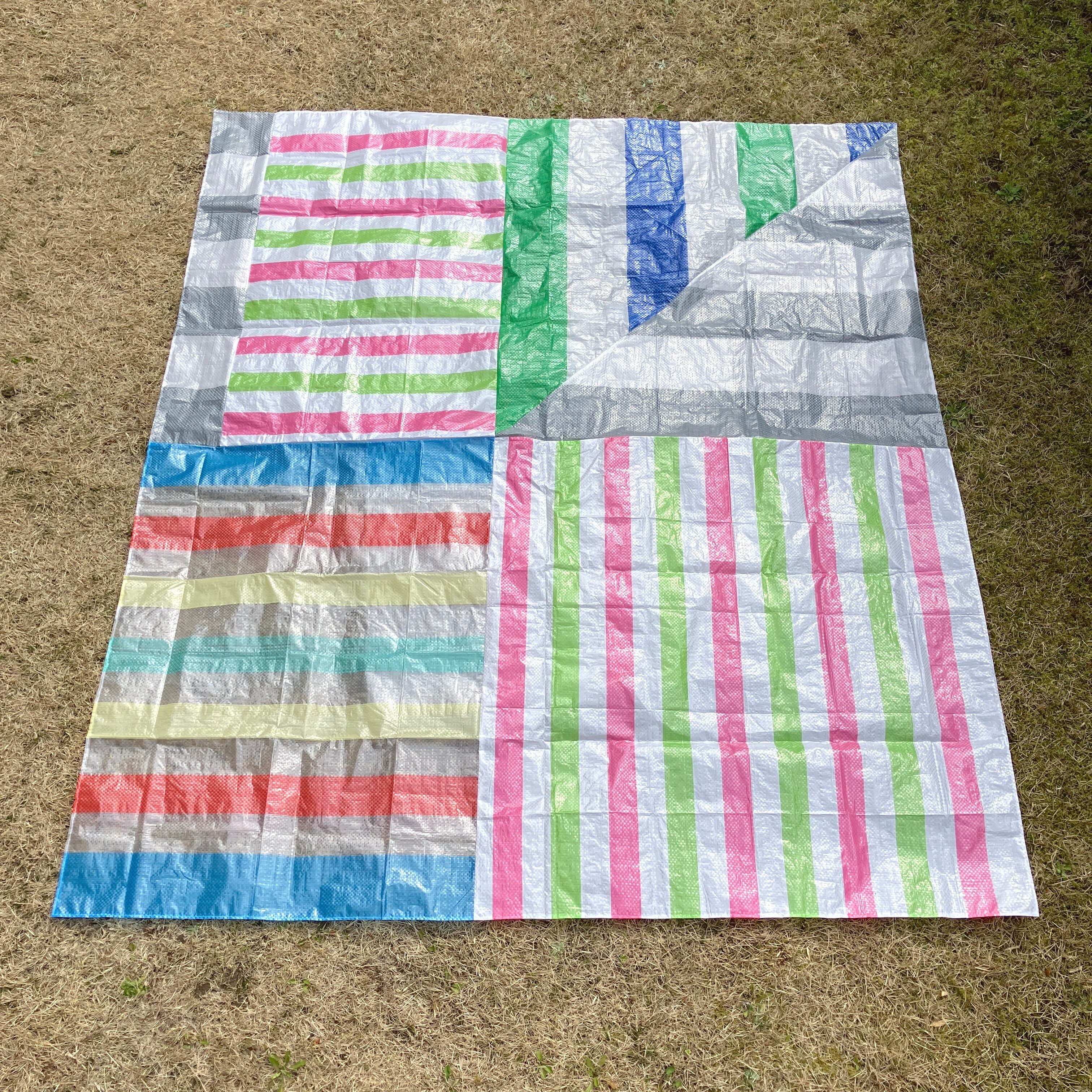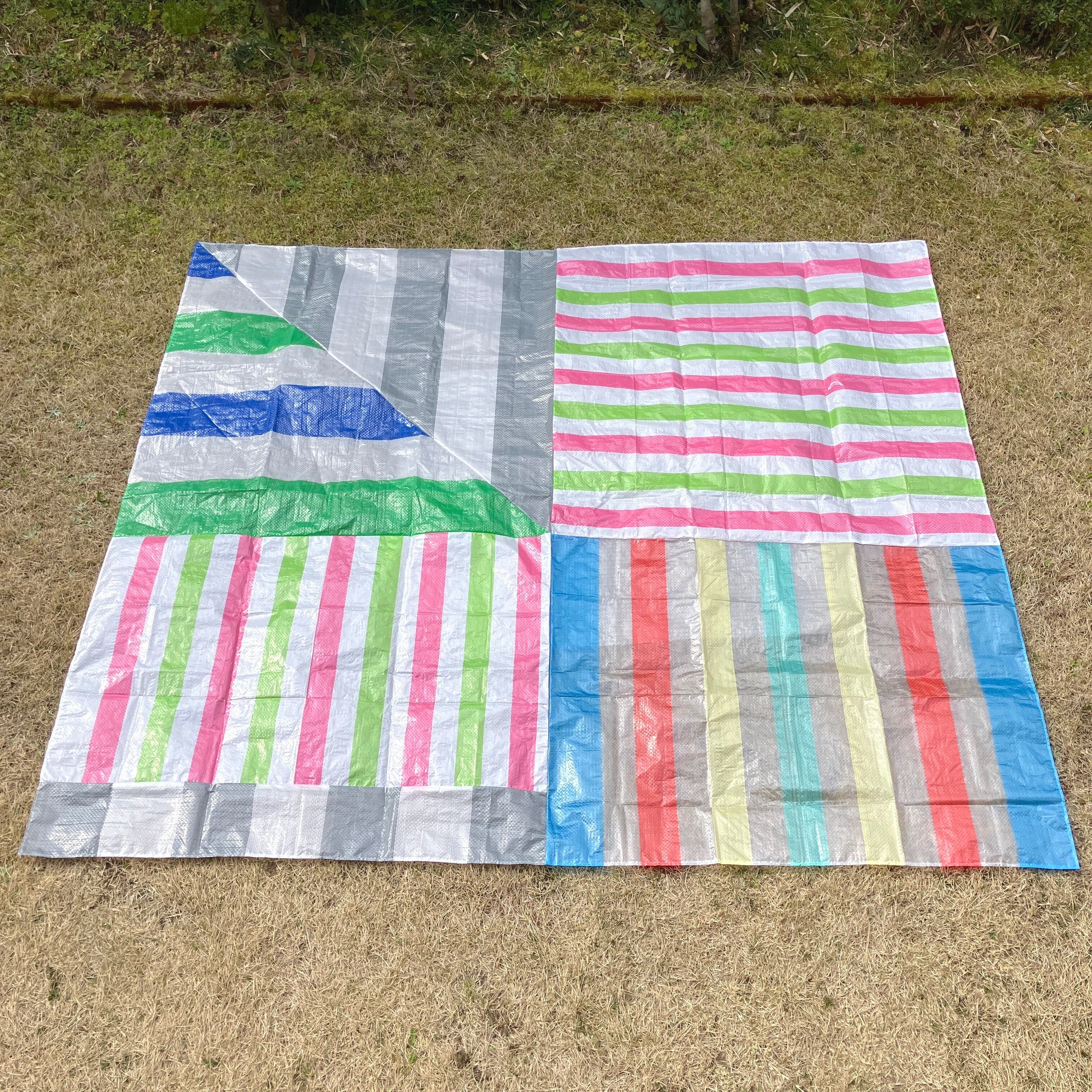 既製品のレジャーシートをランダムに裁断し、再構成して縫い合わせた「レジャーシートのコラージュ」。即興的に構成しているため模様やサイズなどは1点ずつ異なります。