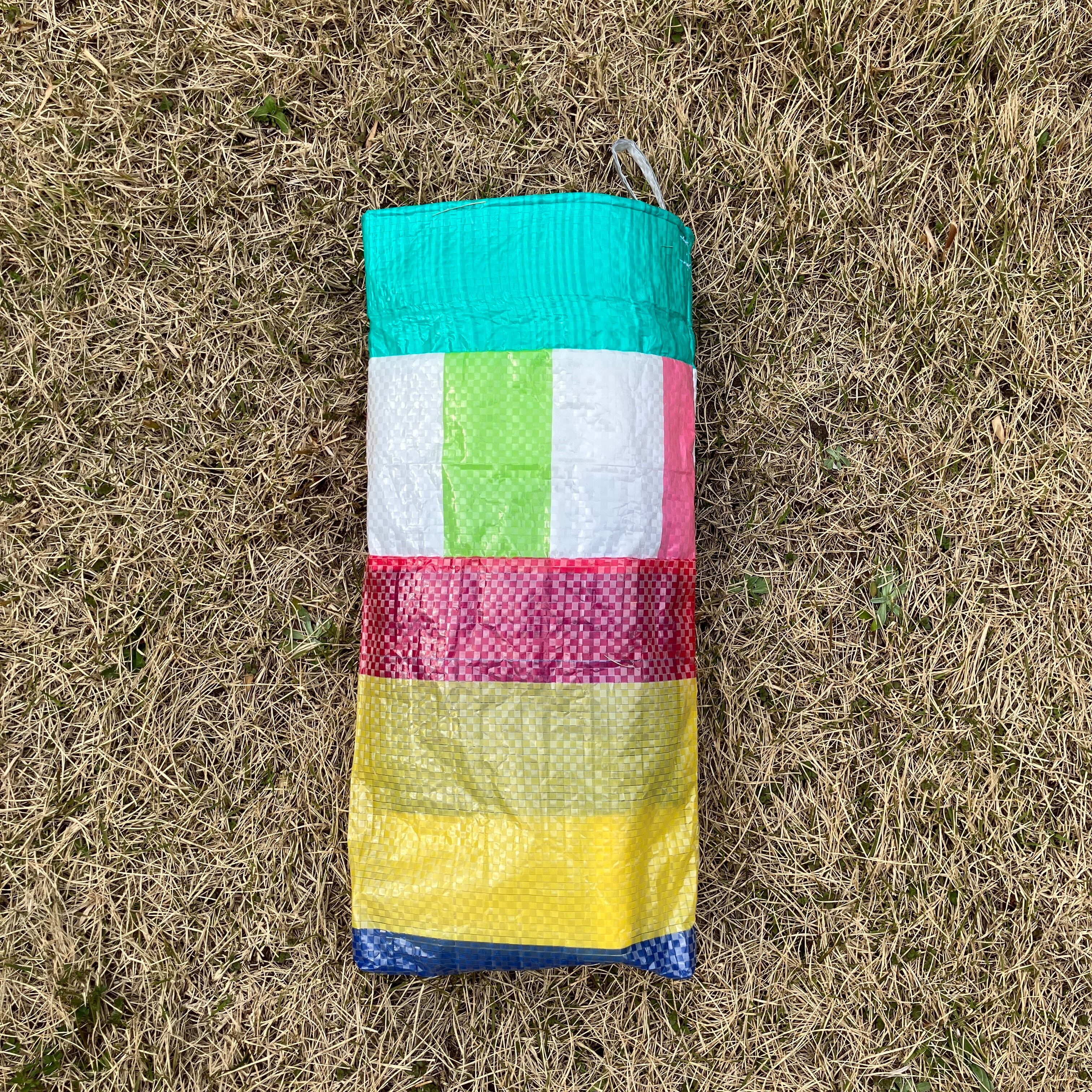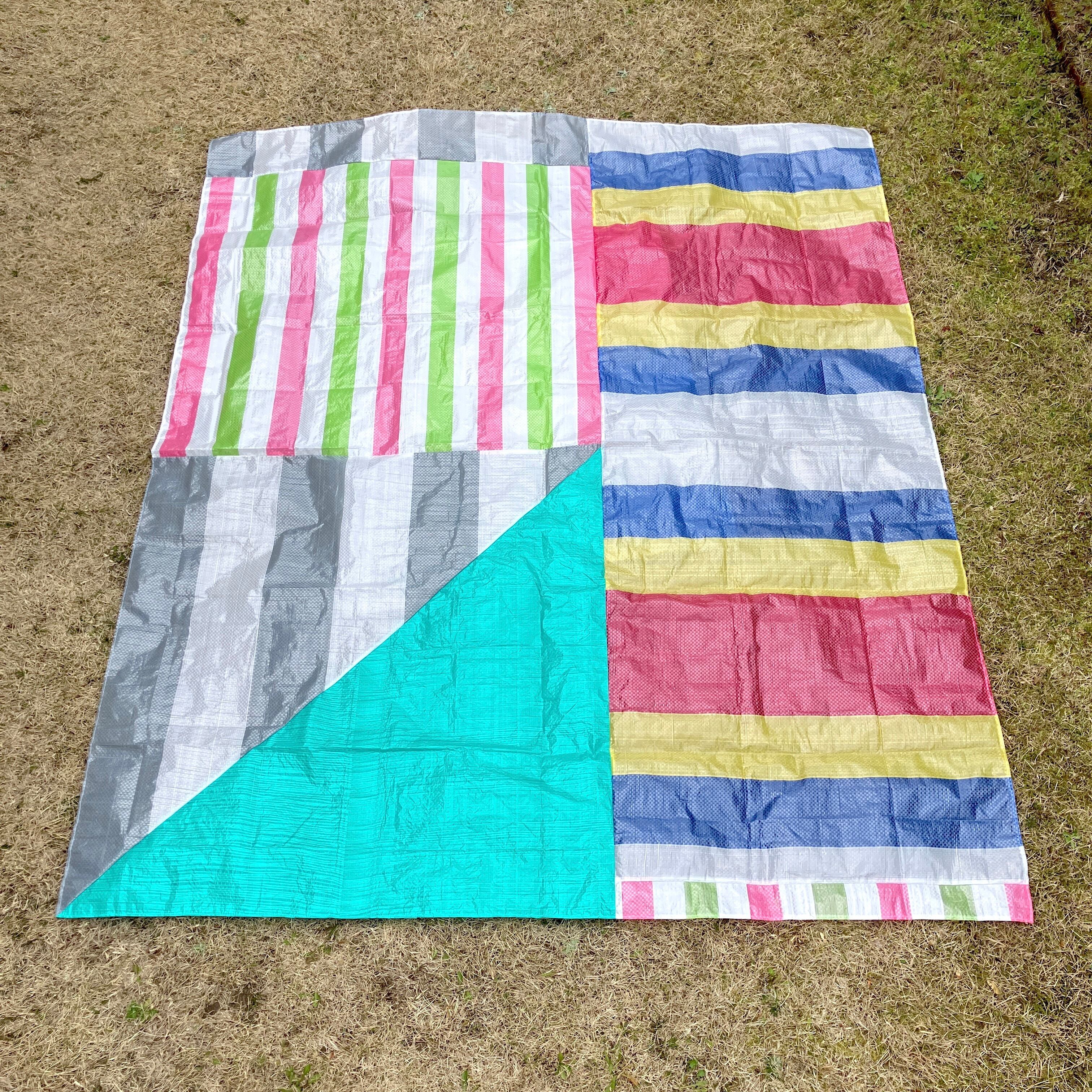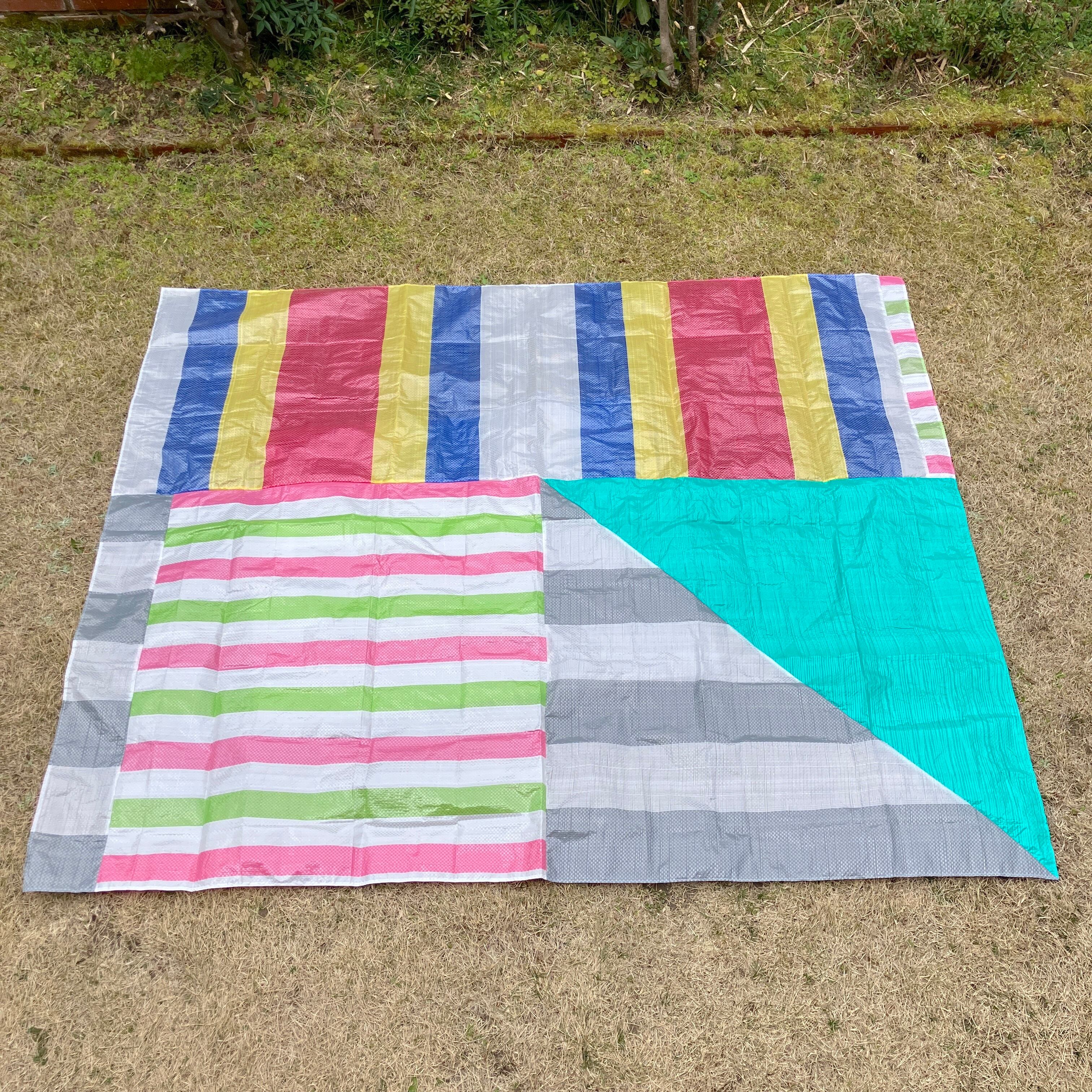 既製品のレジャーシートをランダムに裁断し、再構成して縫い合わせた「レジャーシートのコラージュ」。即興的に構成しているため模様やサイズなどは1点ずつ異なります。