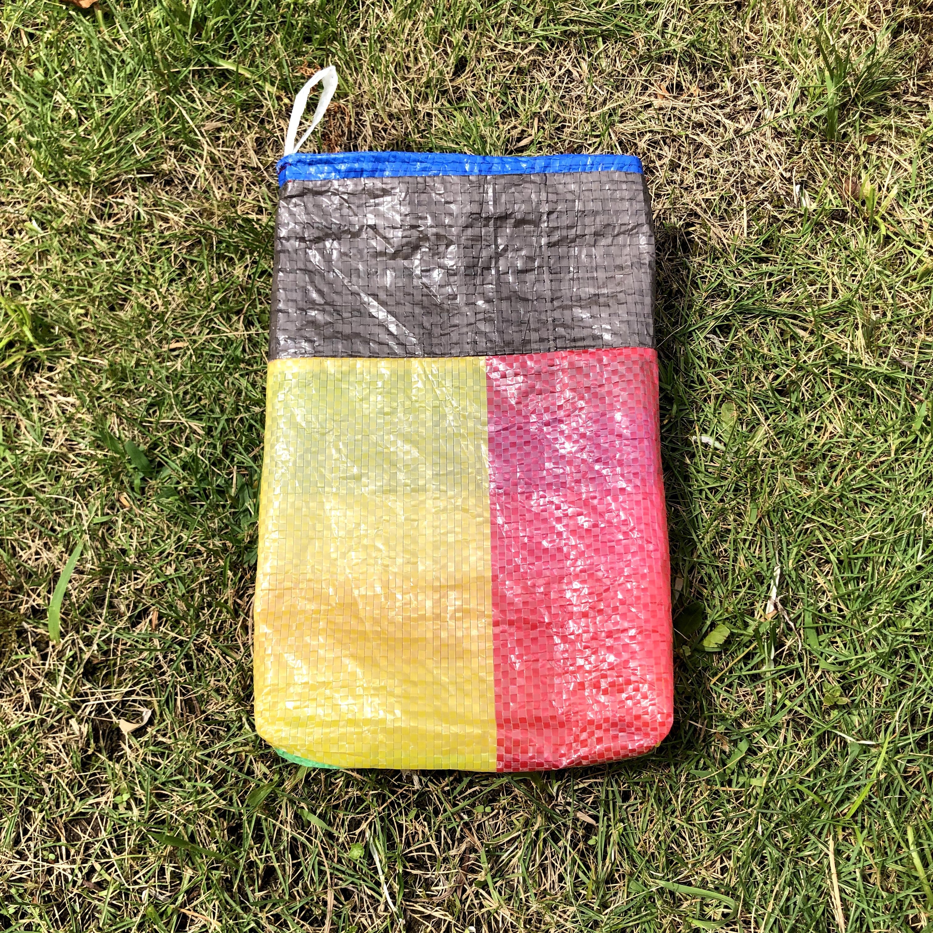 既製品のレジャーシートをランダムに裁断し、再構成して縫い合わせた「レジャーシートのコラージュ」。即興的に構成しているため模様やサイズなどは1点ずつ異なります。