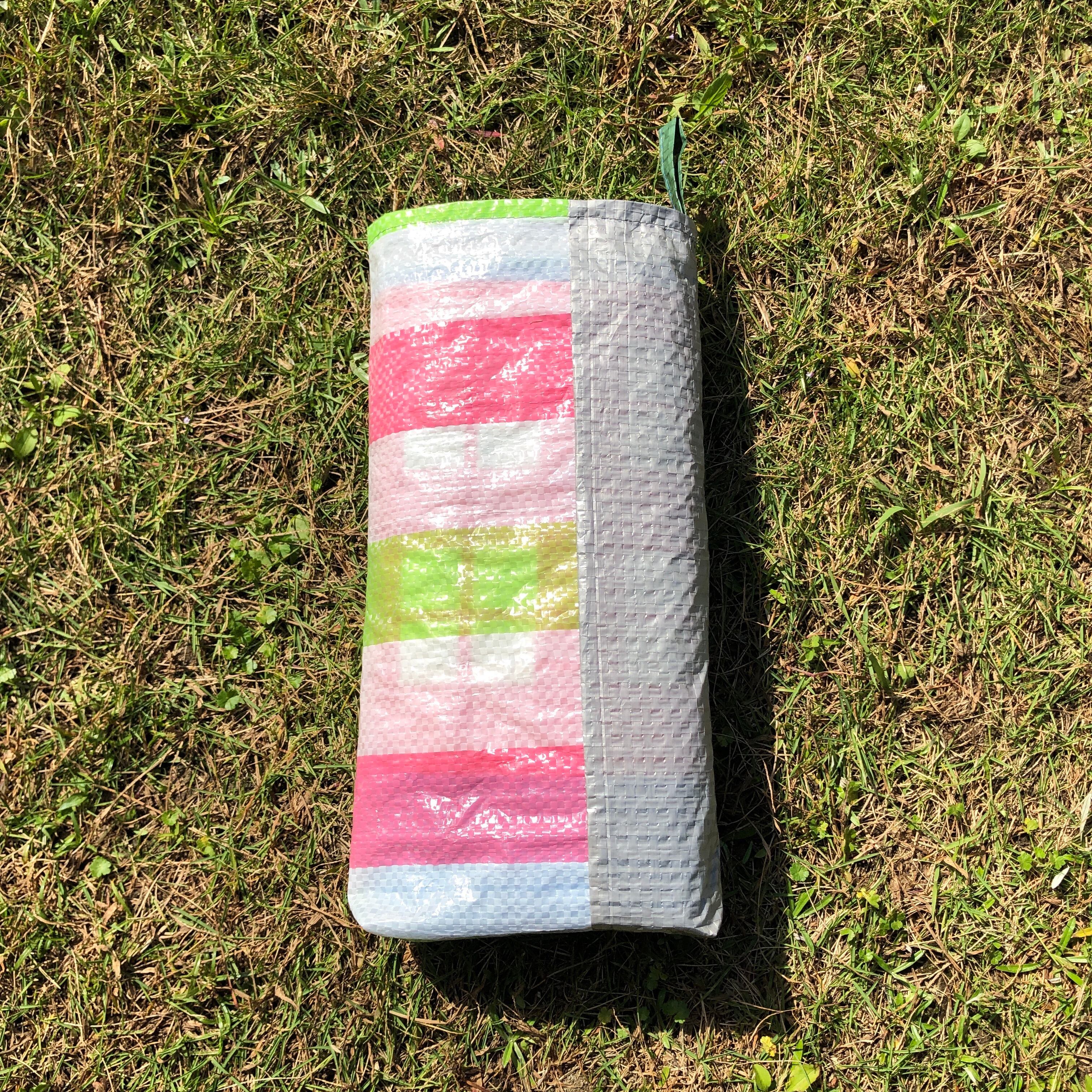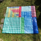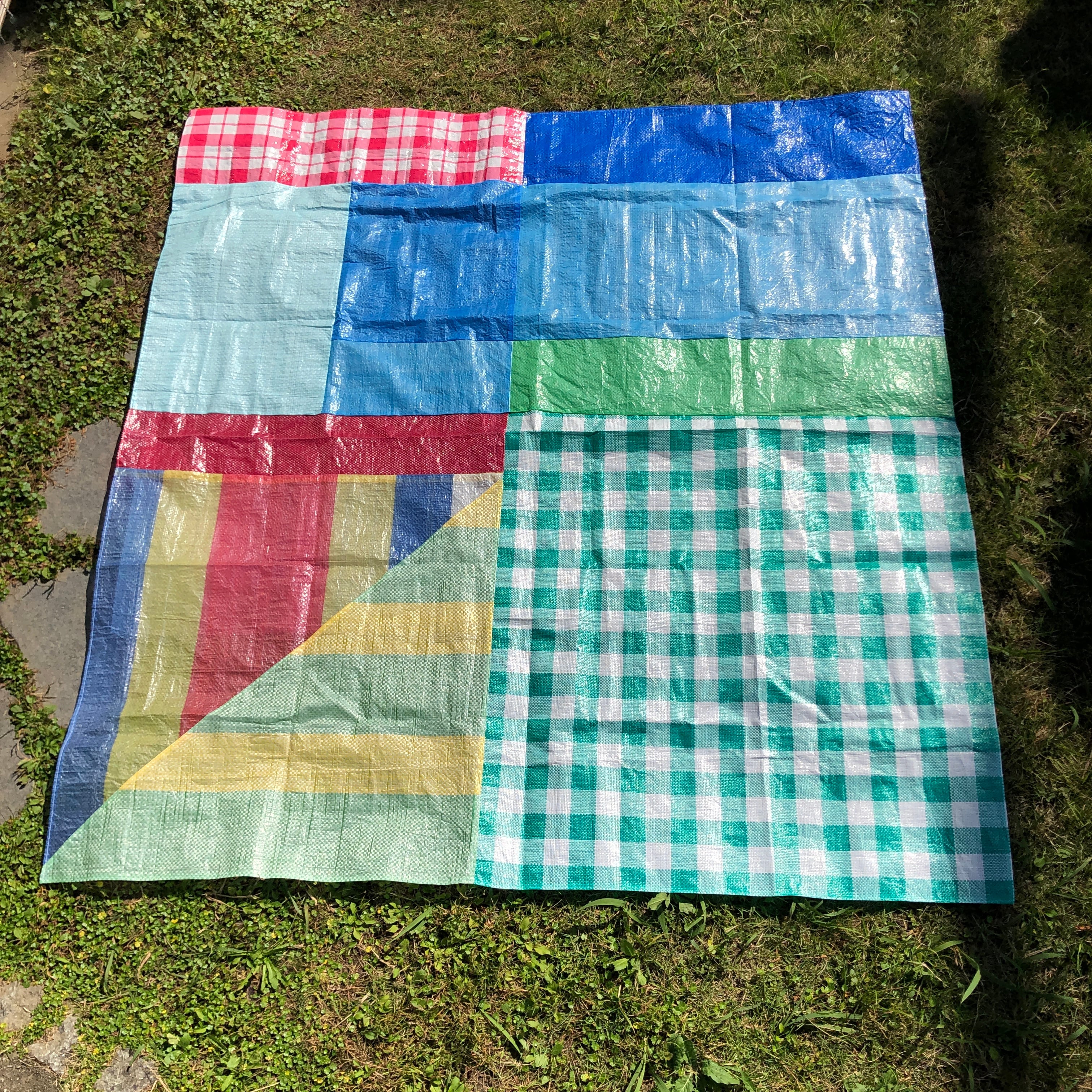 既製品のレジャーシートをランダムに裁断し、再構成して縫い合わせた「レジャーシートのコラージュ」。即興的に構成しているため模様やサイズなどは1点ずつ異なります。