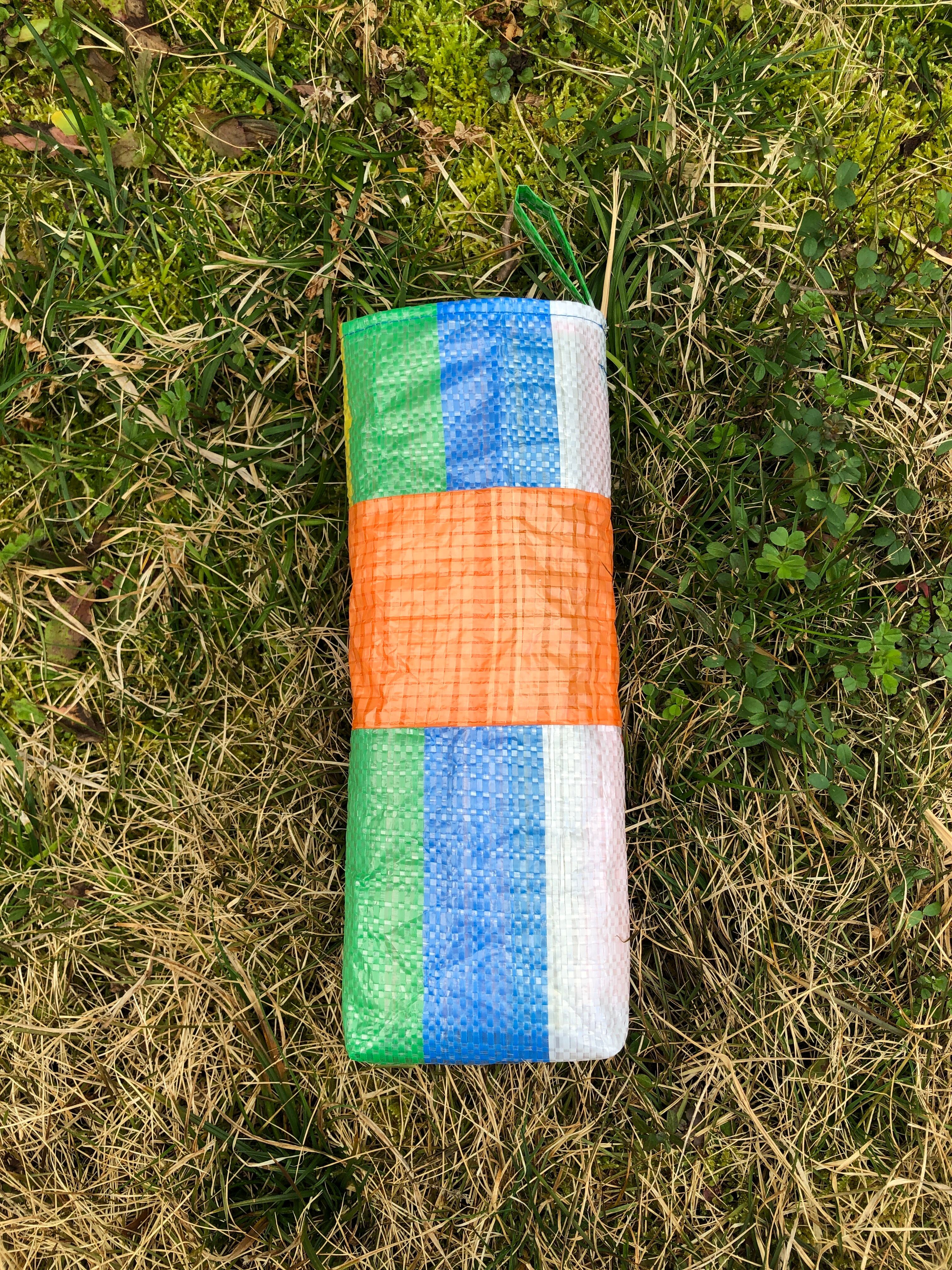 既製品のレジャーシートをランダムに裁断し、再構成して縫い合わせた「レジャーシートのコラージュ」。即興的に構成しているため模様やサイズなどは1点ずつ異なります。