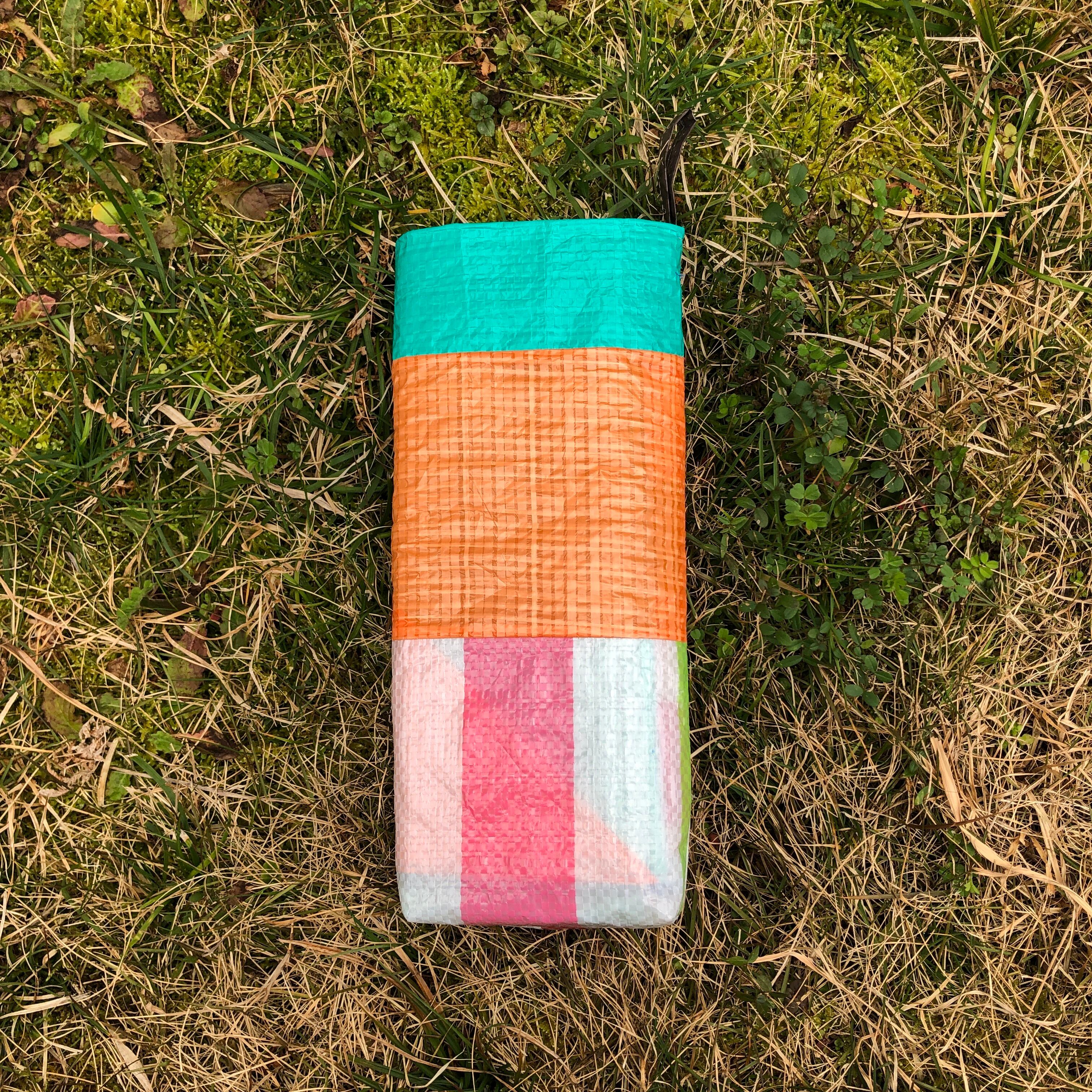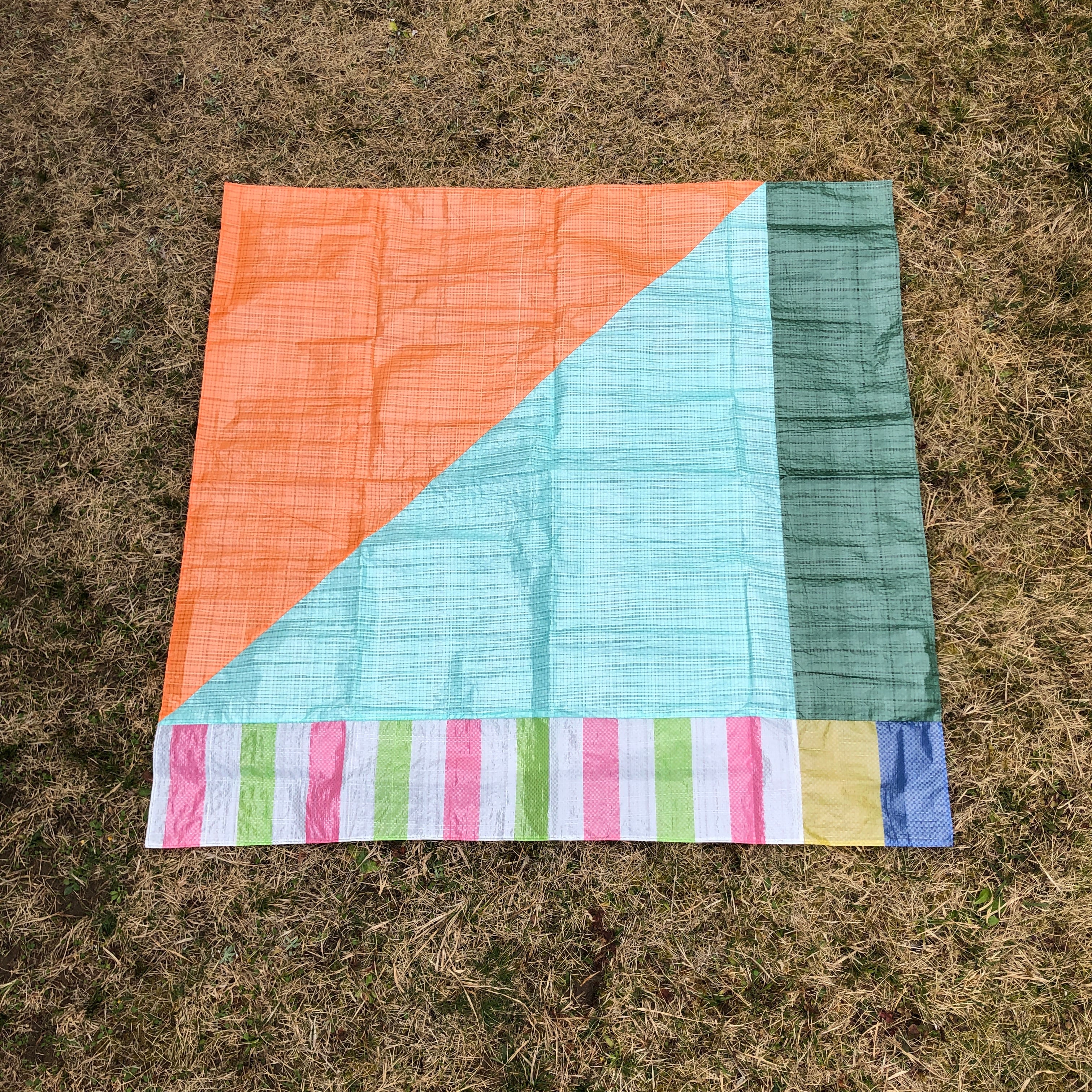 既製品のレジャーシートをランダムに裁断し、再構成して縫い合わせた「レジャーシートのコラージュ」。即興的に構成しているため模様やサイズなどは1点ずつ異なります。