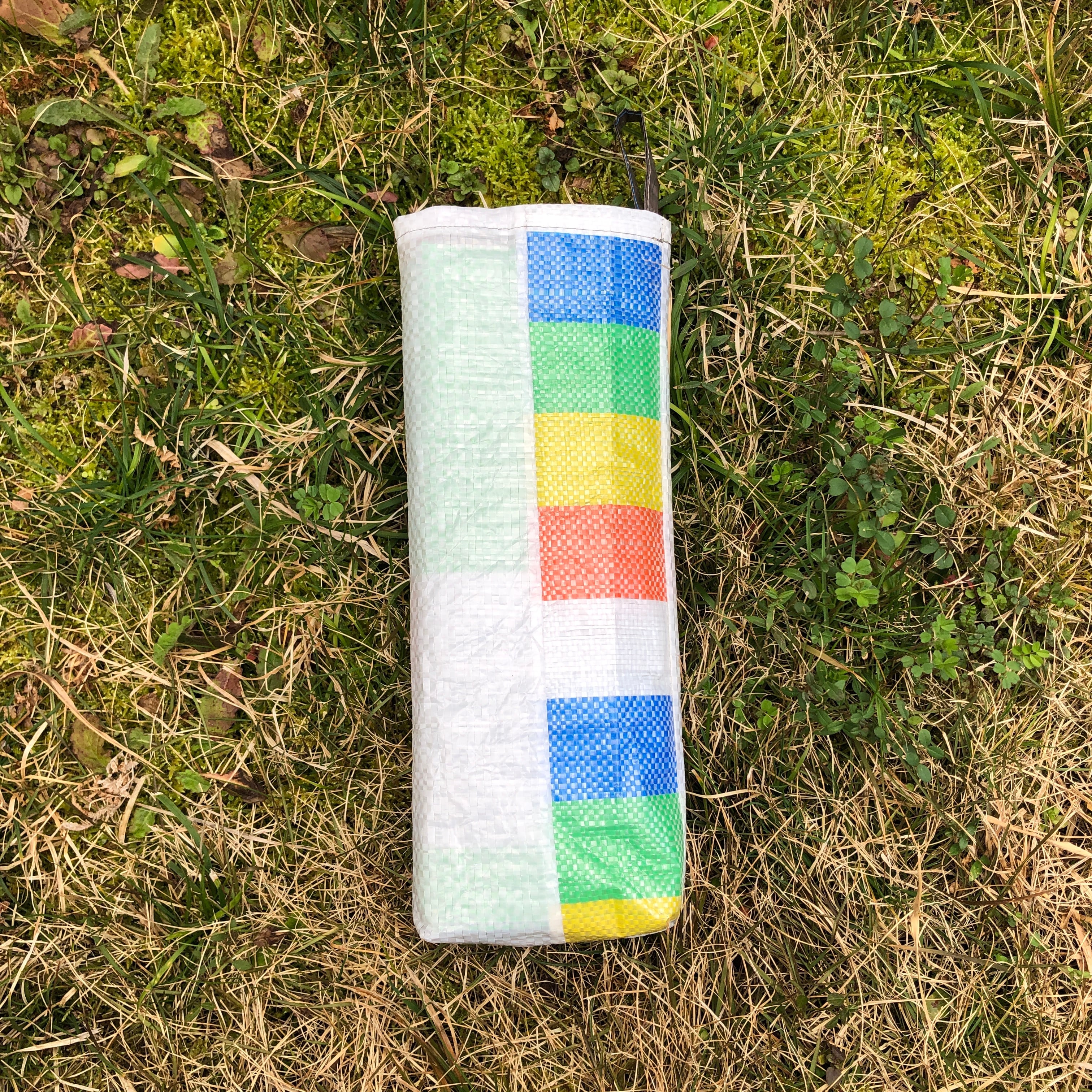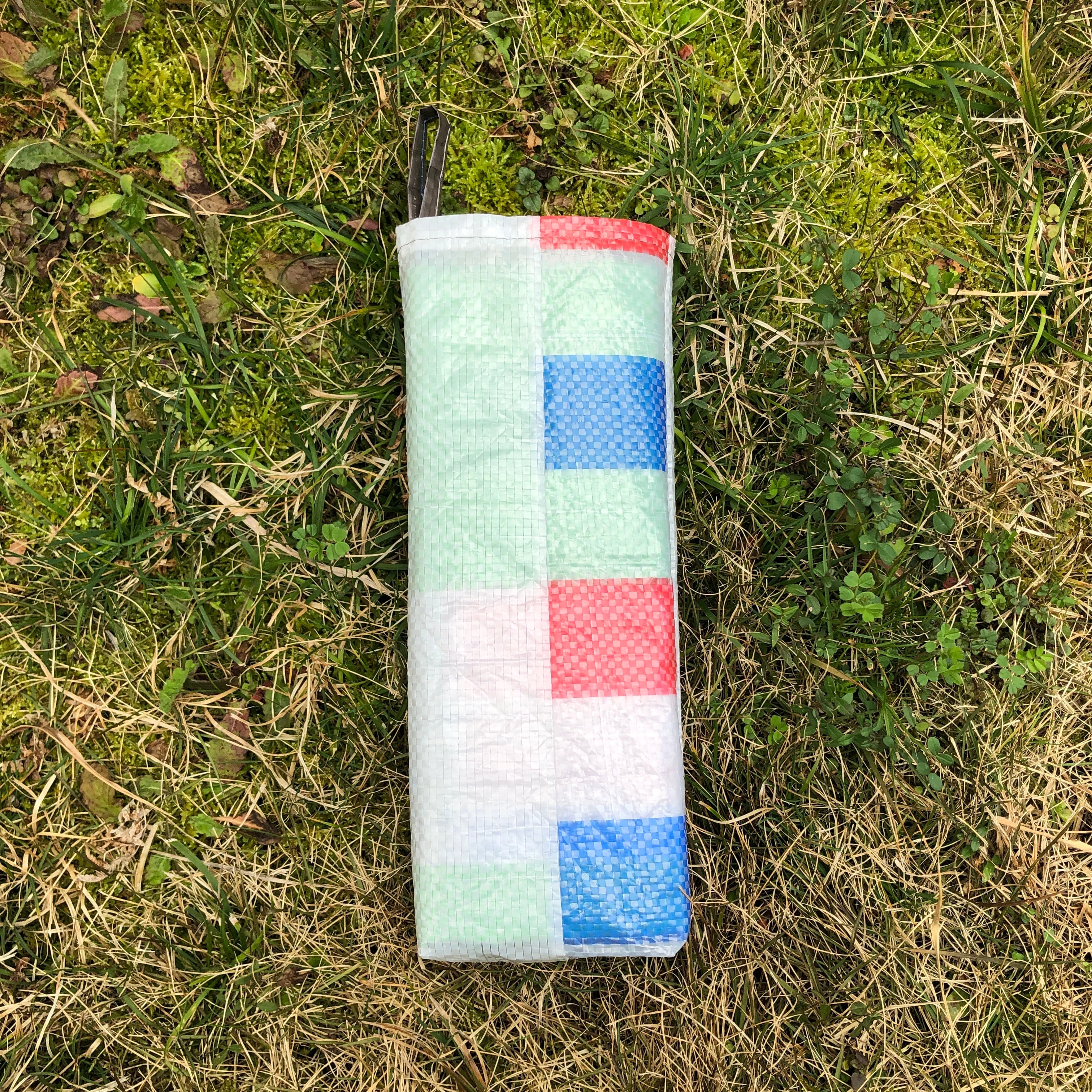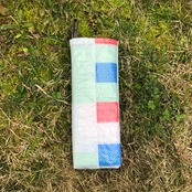既製品のレジャーシートをランダムに裁断し、再構成して縫い合わせた「レジャーシートのコラージュ」。即興的に構成しているため模様やサイズなどは1点ずつ異なります。