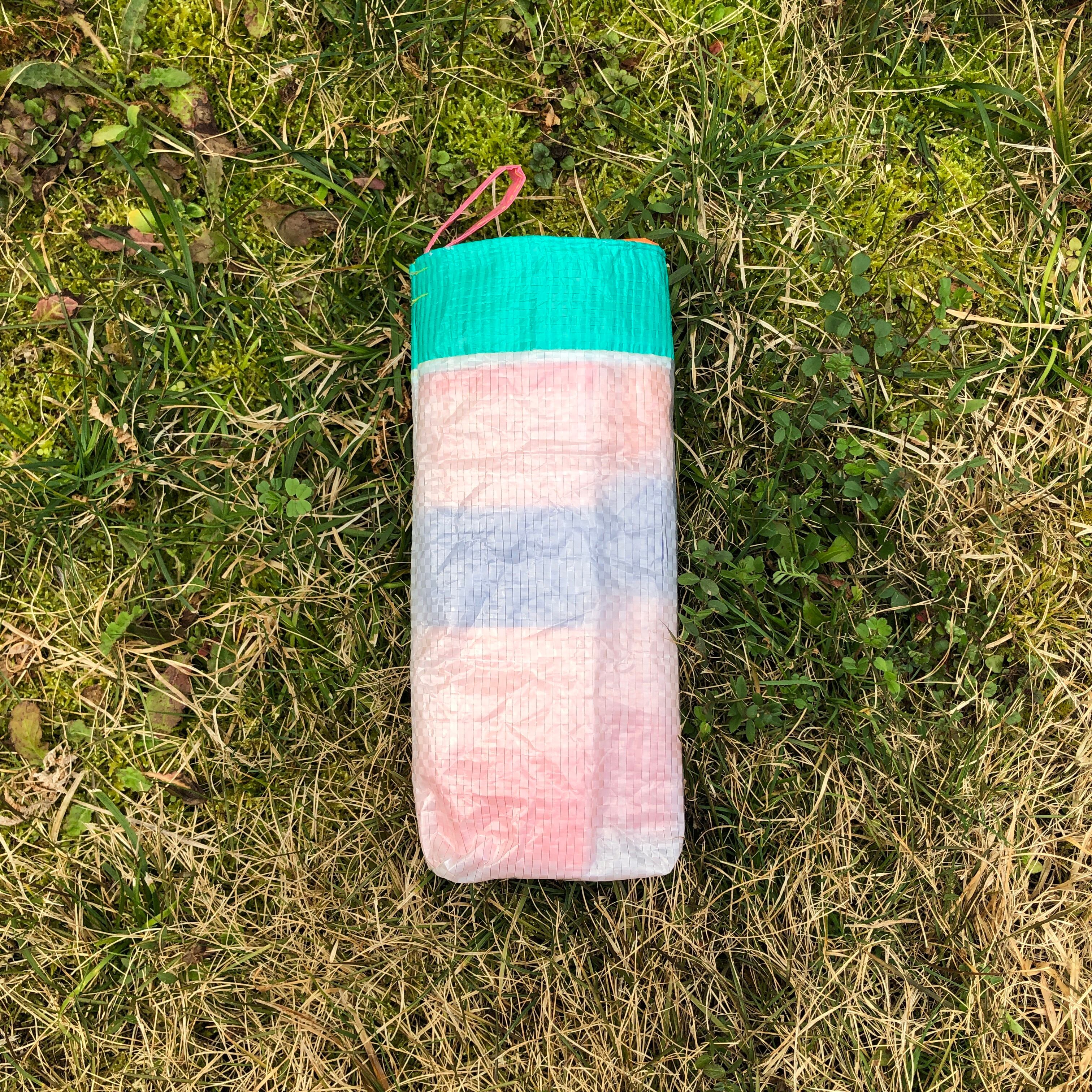 既製品のレジャーシートをランダムに裁断し、再構成して縫い合わせた「レジャーシートのコラージュ」。即興的に構成しているため模様やサイズなどは1点ずつ異なります。