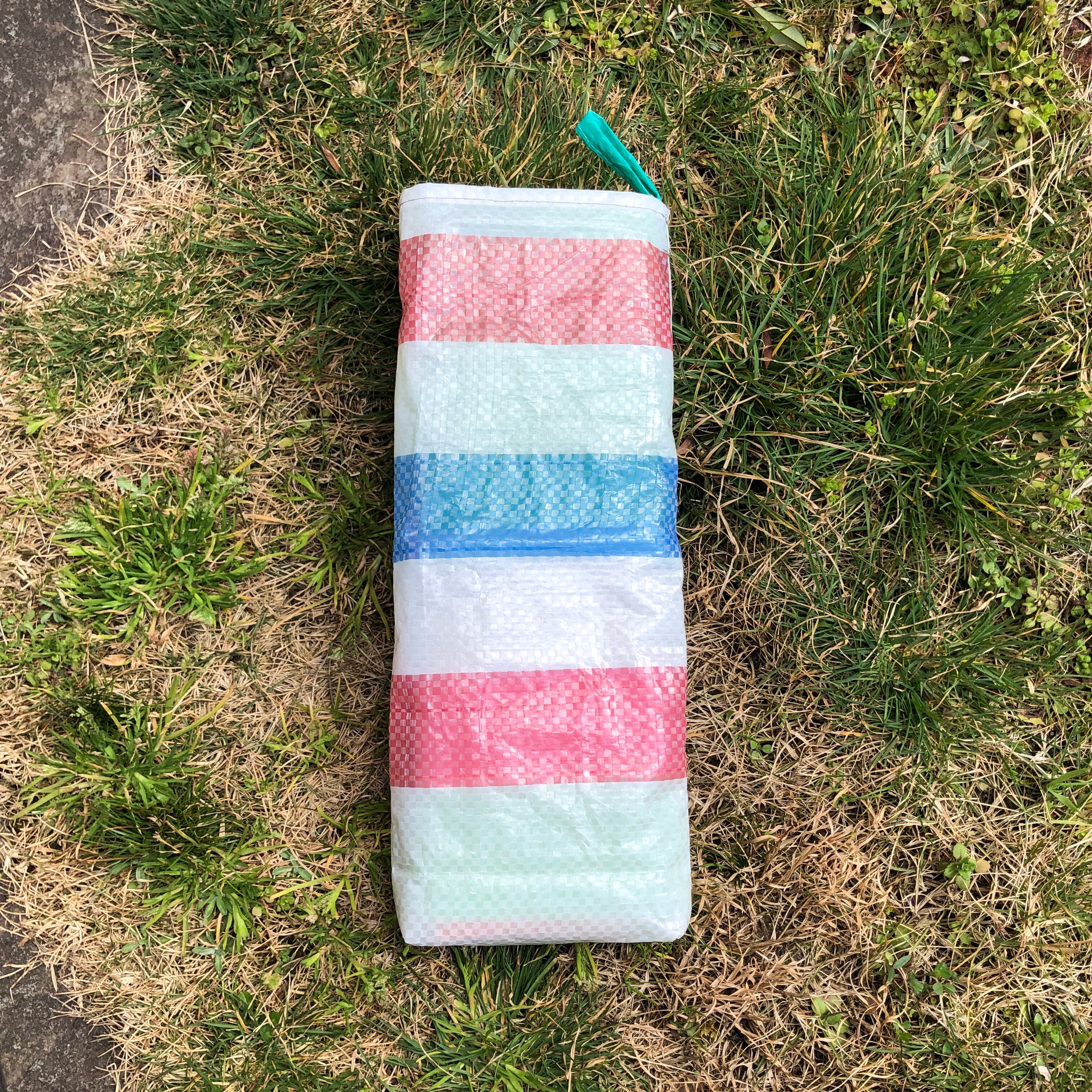 既製品のレジャーシートをランダムに裁断し、再構成して縫い合わせた「レジャーシートのコラージュ」。即興的に構成しているため模様やサイズなどは1点ずつ異なります。