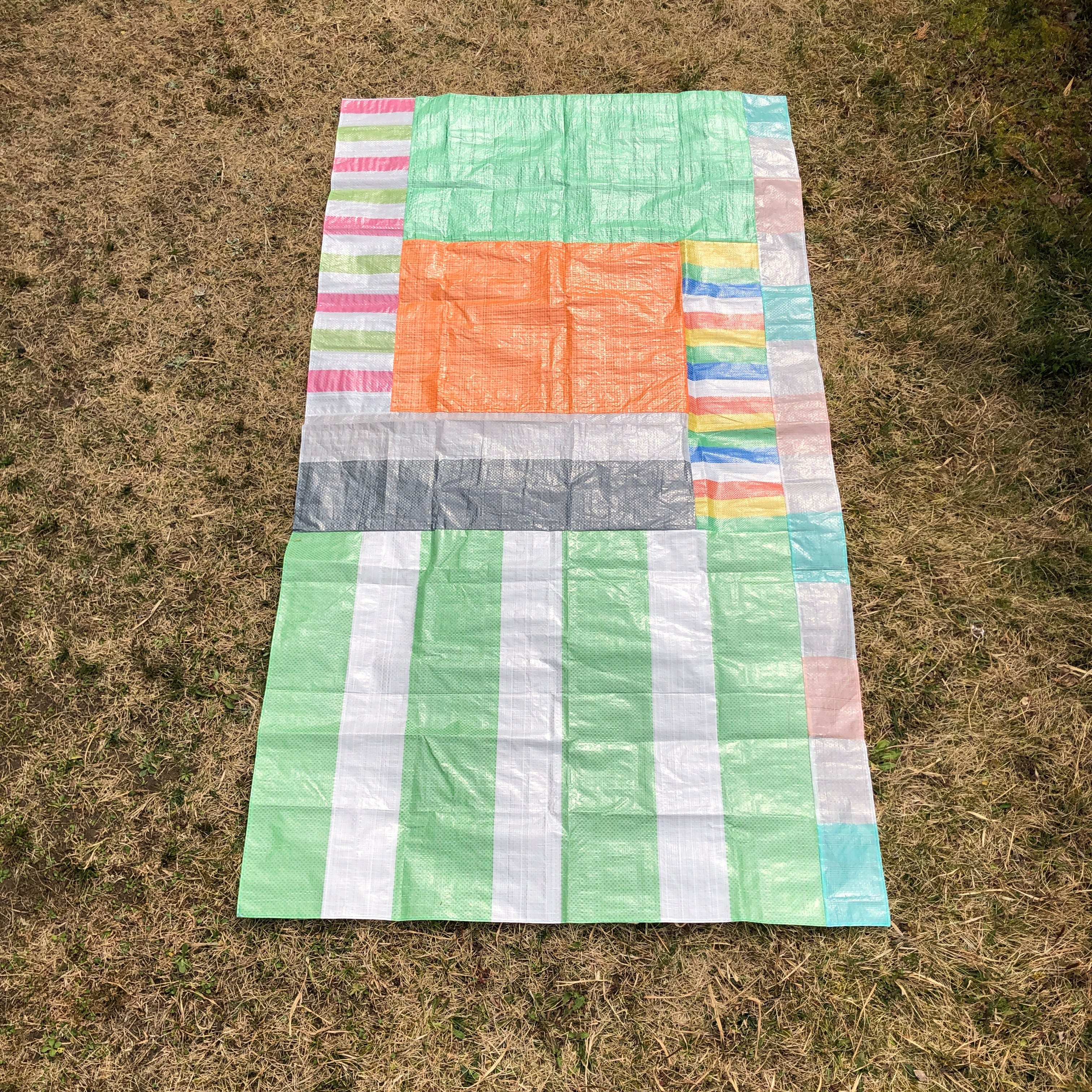 既製品のレジャーシートをランダムに裁断し、再構成して縫い合わせた「レジャーシートのコラージュ」。即興的に構成しているため模様やサイズなどは1点ずつ異なります。