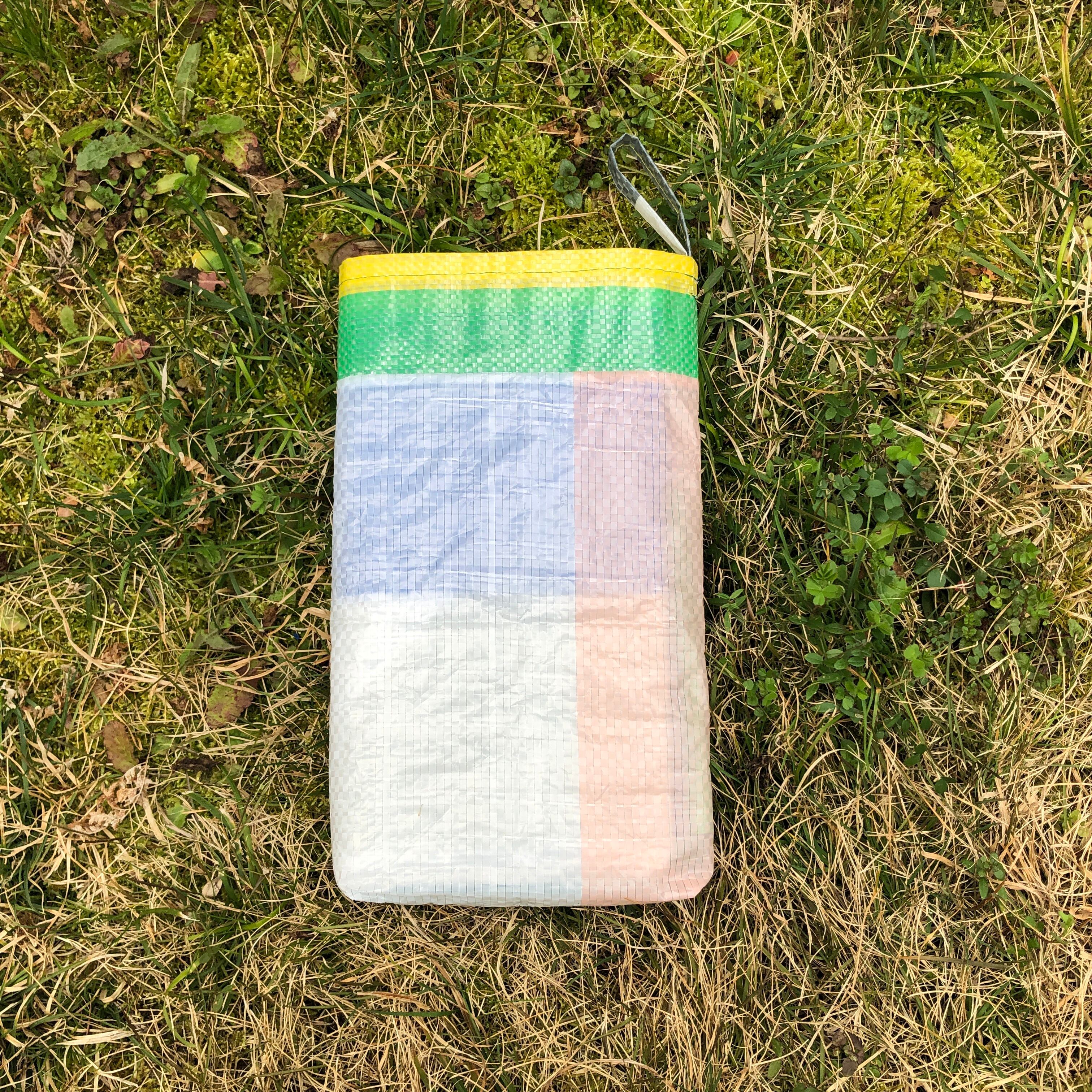 既製品のレジャーシートをランダムに裁断し、再構成して縫い合わせた「レジャーシートのコラージュ」。即興的に構成しているため模様やサイズなどは1点ずつ異なります。