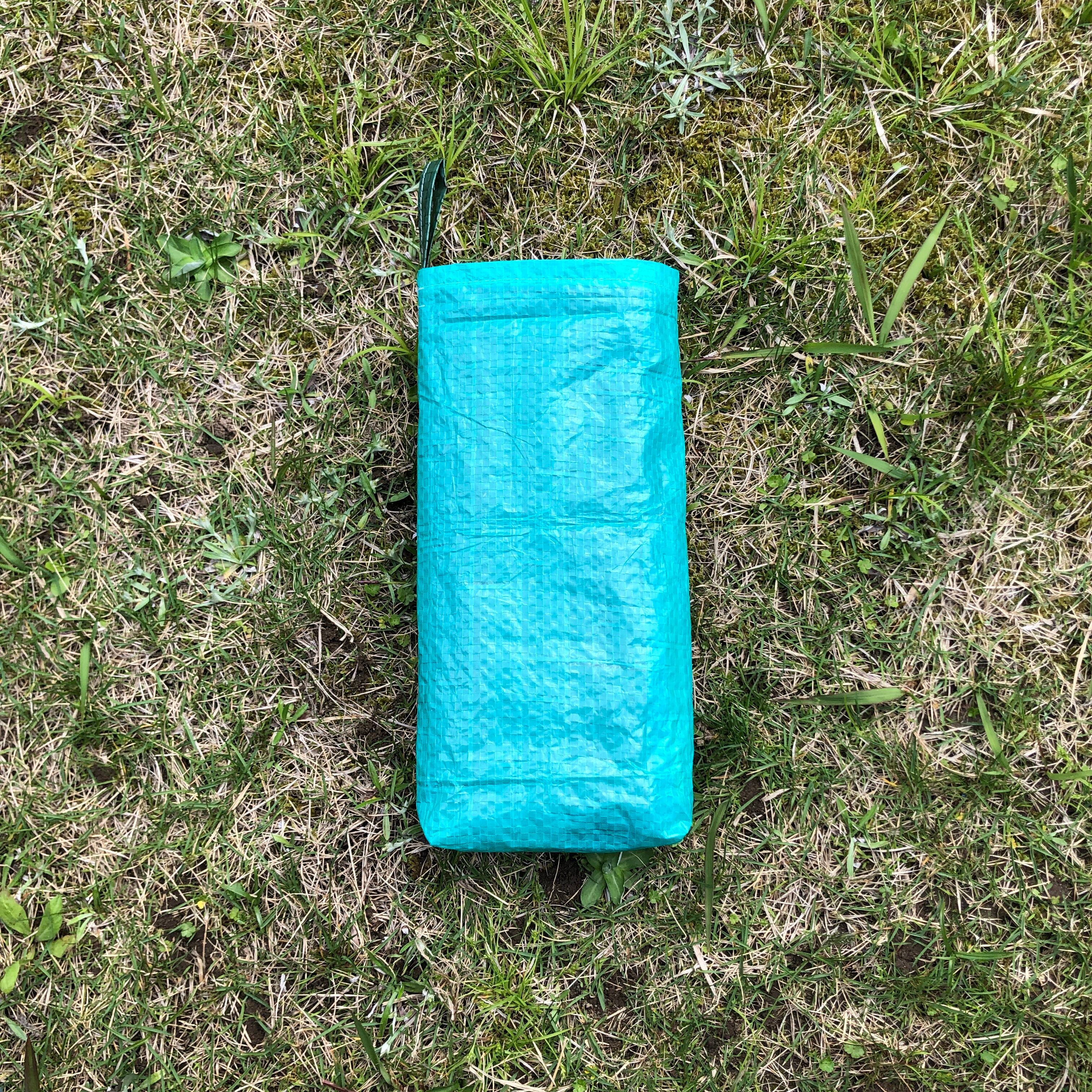 既製品のレジャーシートをランダムに裁断し、再構成して縫い合わせた「レジャーシートのコラージュ」。即興的に構成しているため模様やサイズなどは1点ずつ異なります。