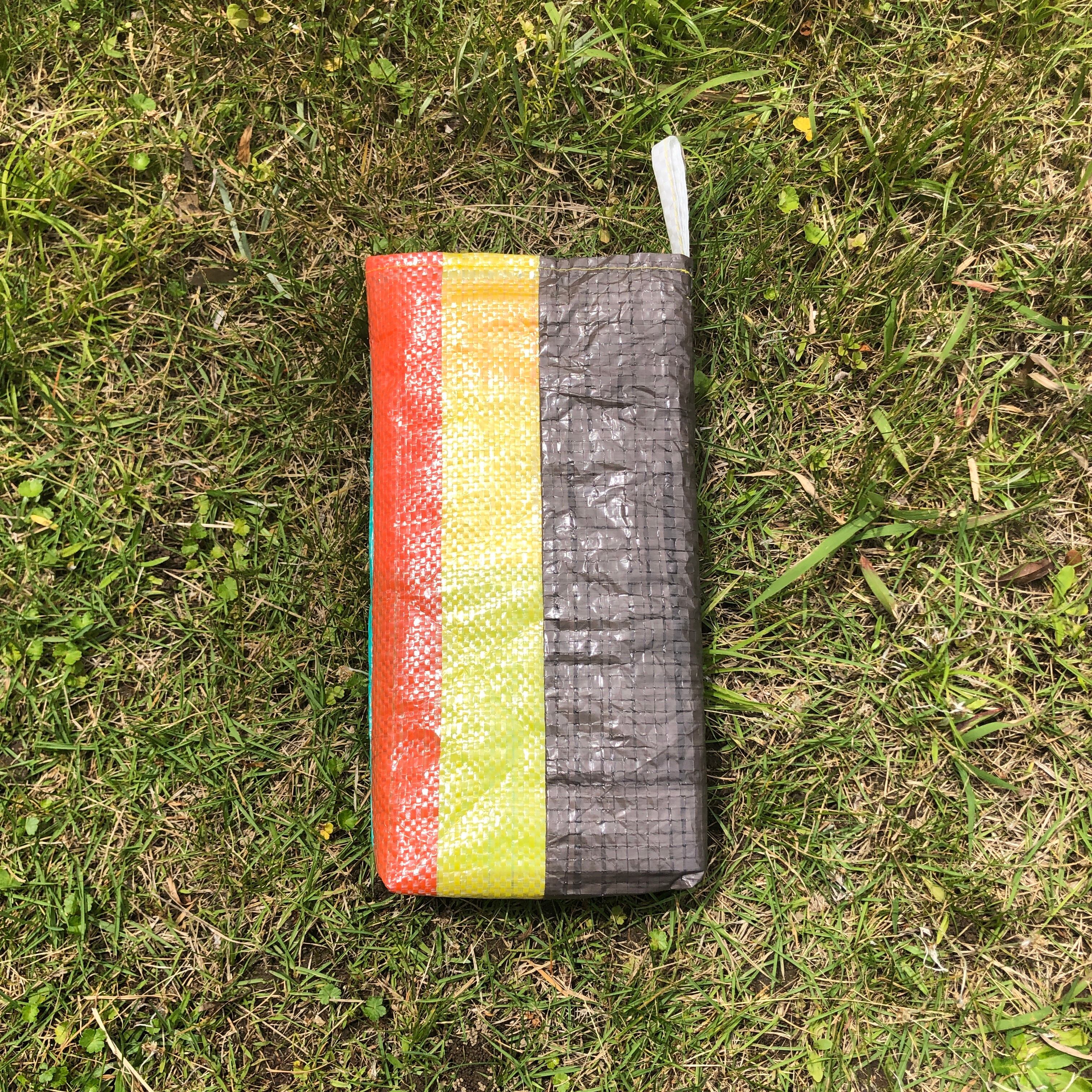 既製品のレジャーシートをランダムに裁断し、再構成して縫い合わせた「レジャーシートのコラージュ」。即興的に構成しているため模様やサイズなどは1点ずつ異なります。