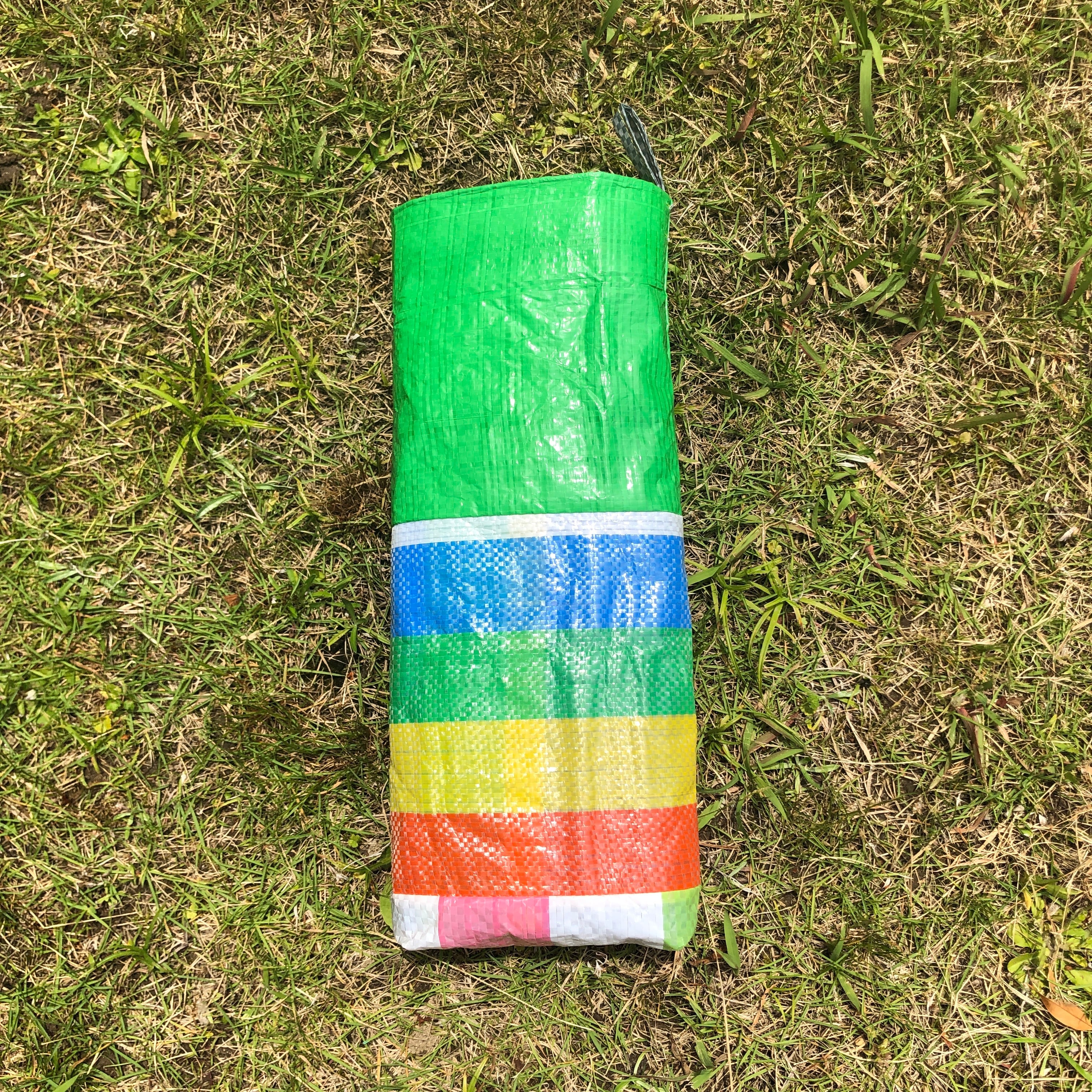 既製品のレジャーシートをランダムに裁断し、再構成して縫い合わせた「レジャーシートのコラージュ」。即興的に構成しているため模様やサイズなどは1点ずつ異なります。