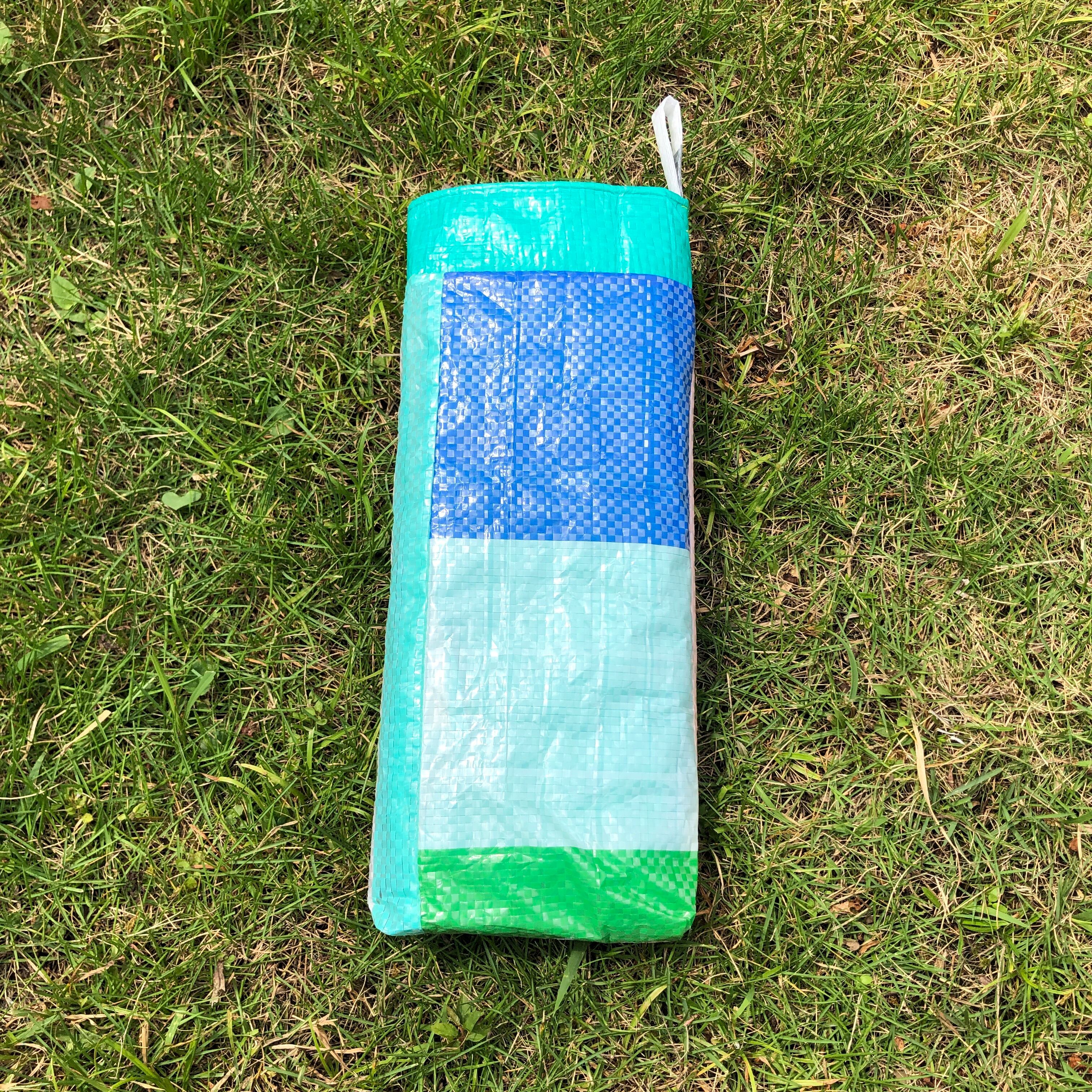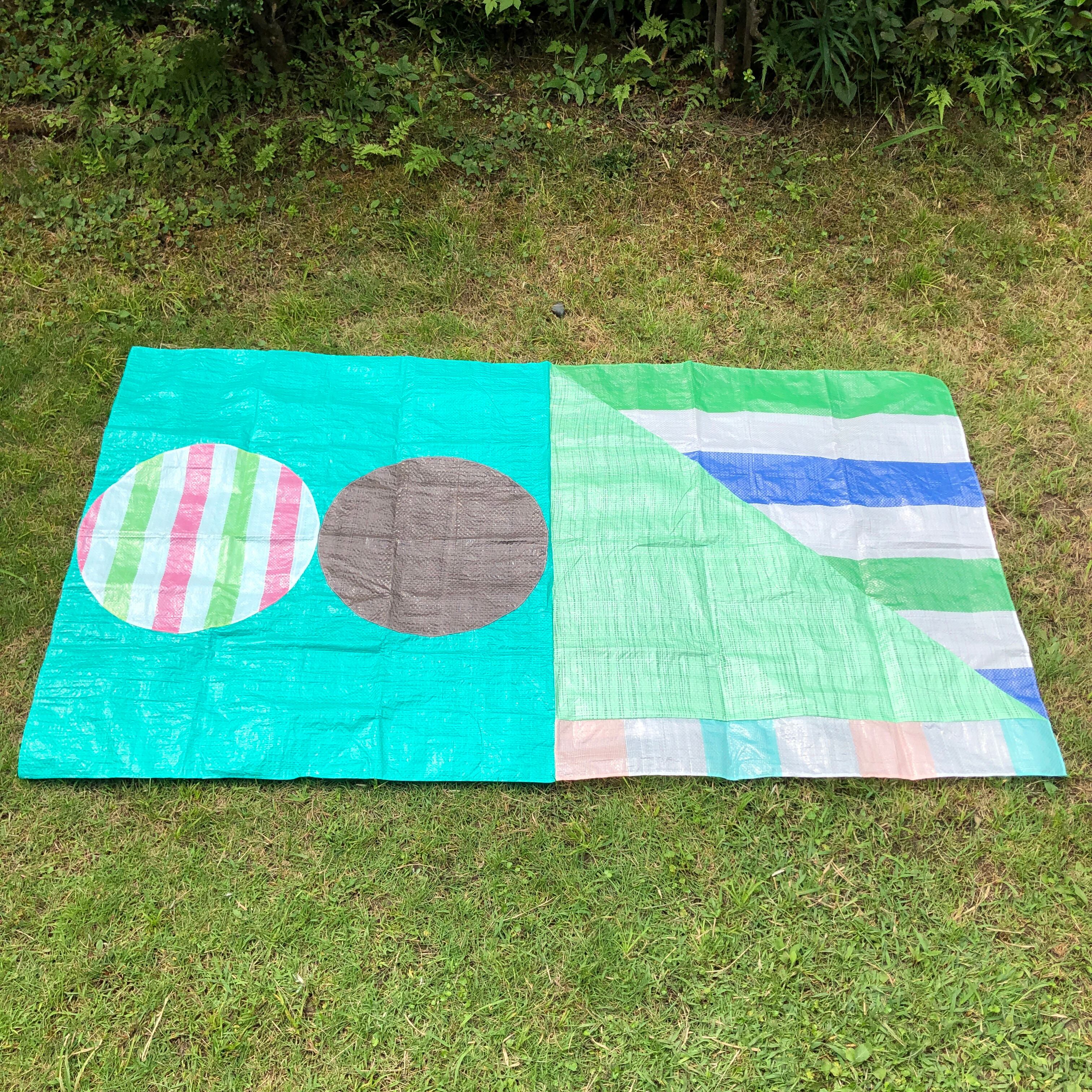 既製品のレジャーシートをランダムに裁断し、再構成して縫い合わせた「レジャーシートのコラージュ」。即興的に構成しているため模様やサイズなどは1点ずつ異なります。