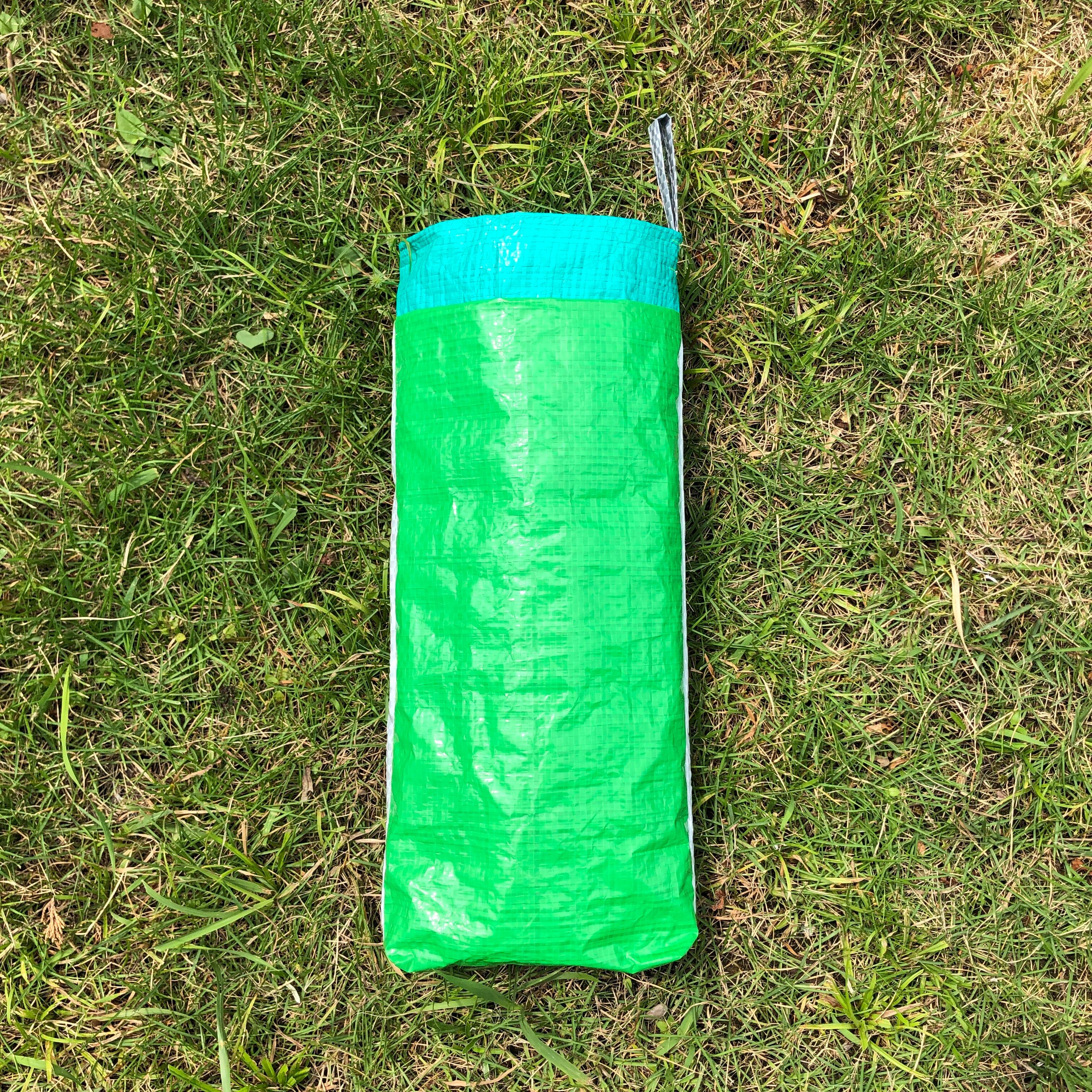 既製品のレジャーシートをランダムに裁断し、再構成して縫い合わせた「レジャーシートのコラージュ」。即興的に構成しているため模様やサイズなどは1点ずつ異なります。