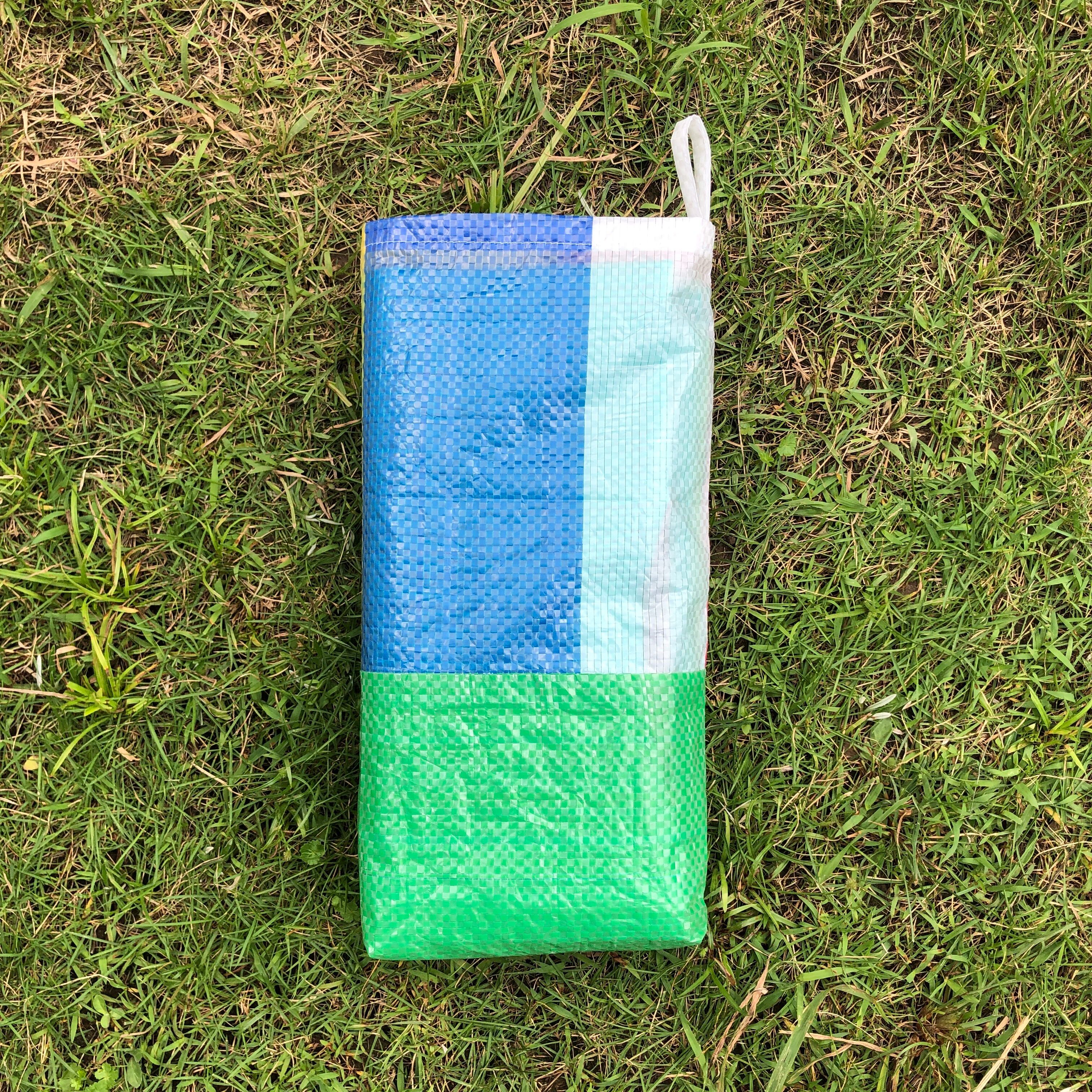 既製品のレジャーシートをランダムに裁断し、再構成して縫い合わせた「レジャーシートのコラージュ」。即興的に構成しているため模様やサイズなどは1点ずつ異なります。