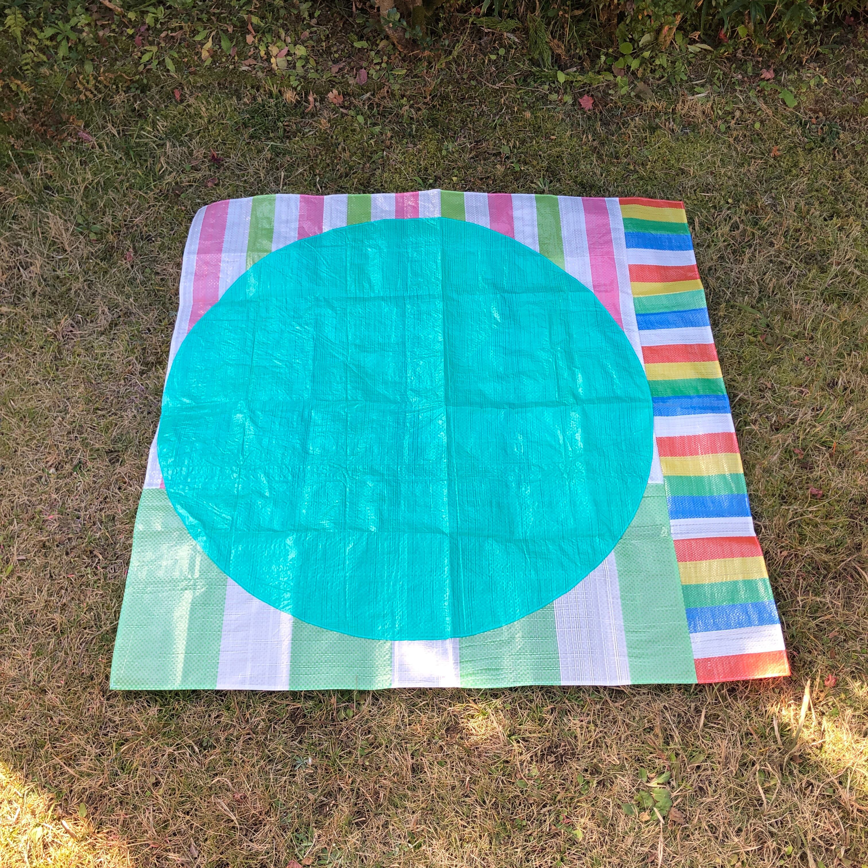 既製品のレジャーシートをランダムに裁断し、再構成して縫い合わせた「レジャーシートのコラージュ」。即興的に構成しているため模様やサイズなどは1点ずつ異なります。