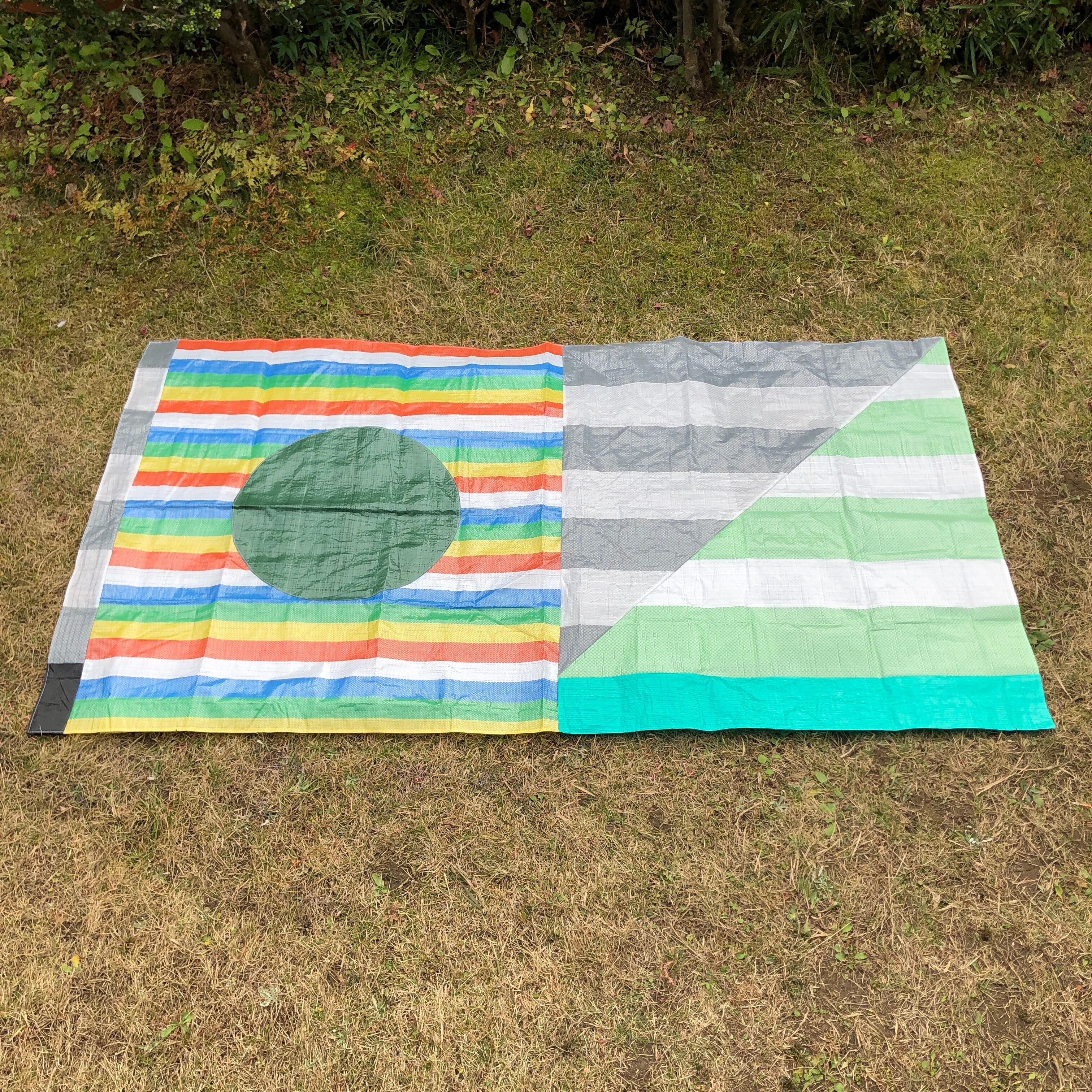 既製品のレジャーシートをランダムに裁断し、再構成して縫い合わせた「レジャーシートのコラージュ」。即興的に構成しているため模様やサイズなどは1点ずつ異なります。