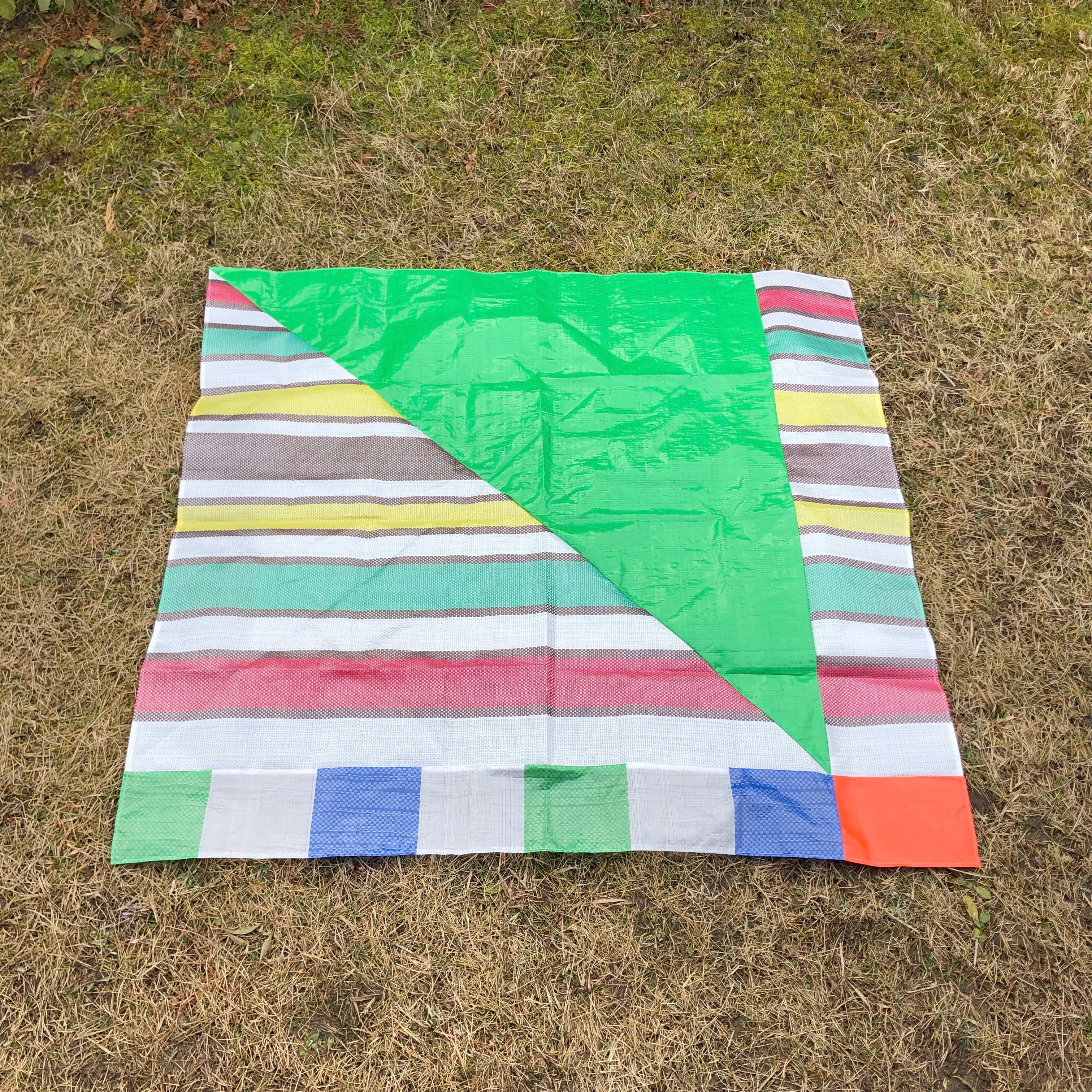 既製品のレジャーシートをランダムに裁断し、再構成して縫い合わせた「レジャーシートのコラージュ」。即興的に構成しているため模様やサイズなどは1点ずつ異なります。