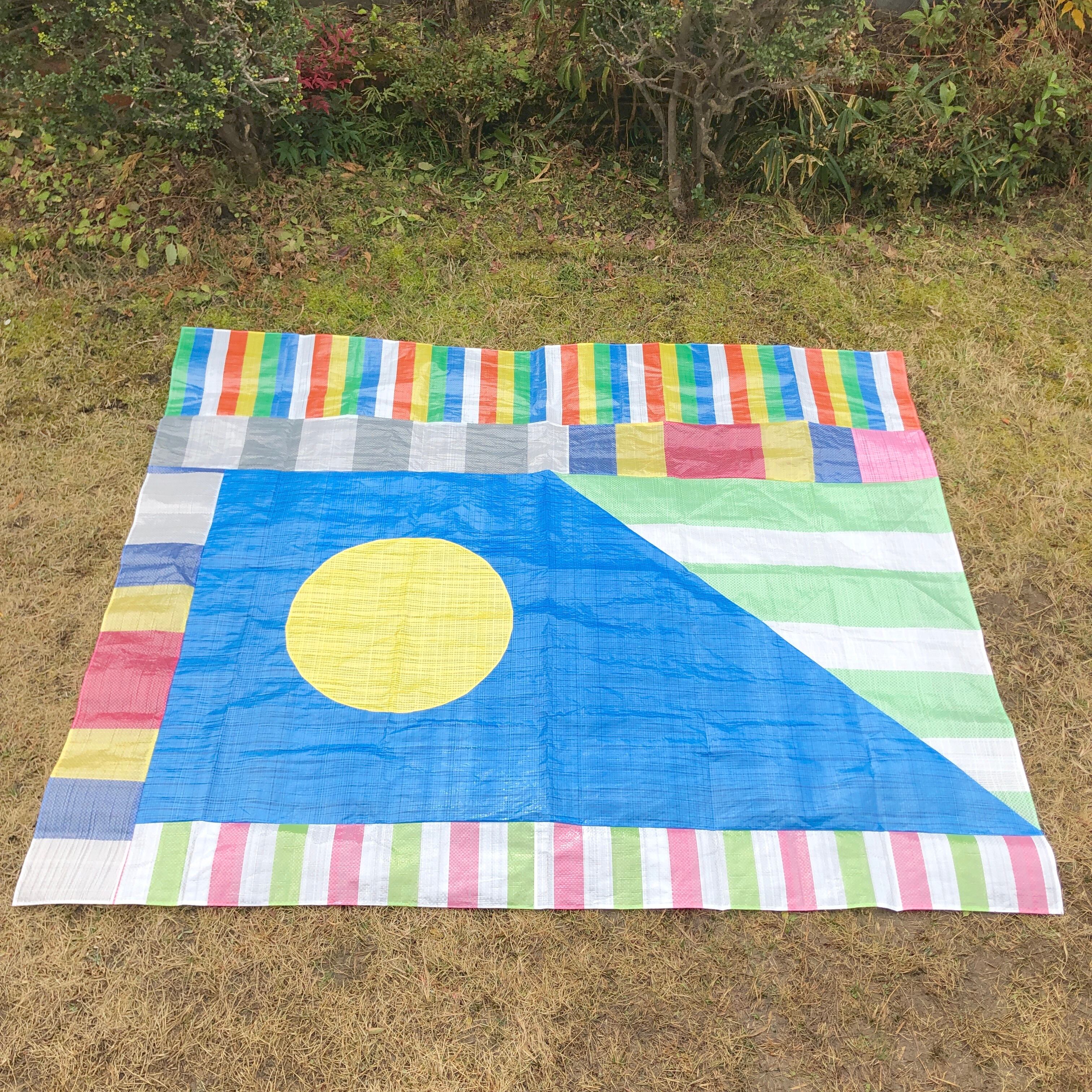 既製品のレジャーシートをランダムに裁断し、再構成して縫い合わせた「レジャーシートのコラージュ」。即興的に構成しているため模様やサイズなどは1点ずつ異なります。
