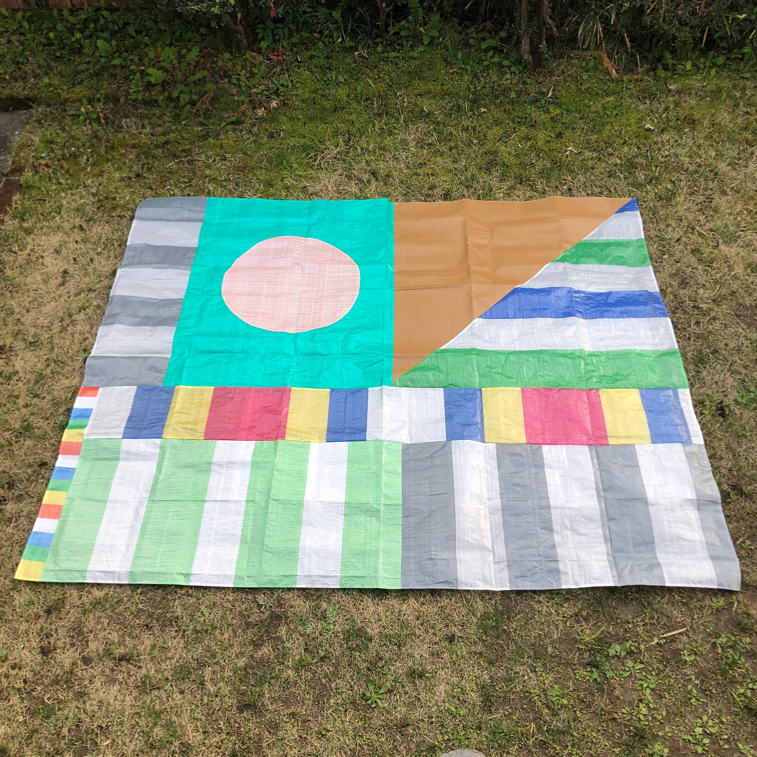 既製品のレジャーシートをランダムに裁断し、再構成して縫い合わせた「レジャーシートのコラージュ」。即興的に構成しているため模様やサイズなどは1点ずつ異なります。