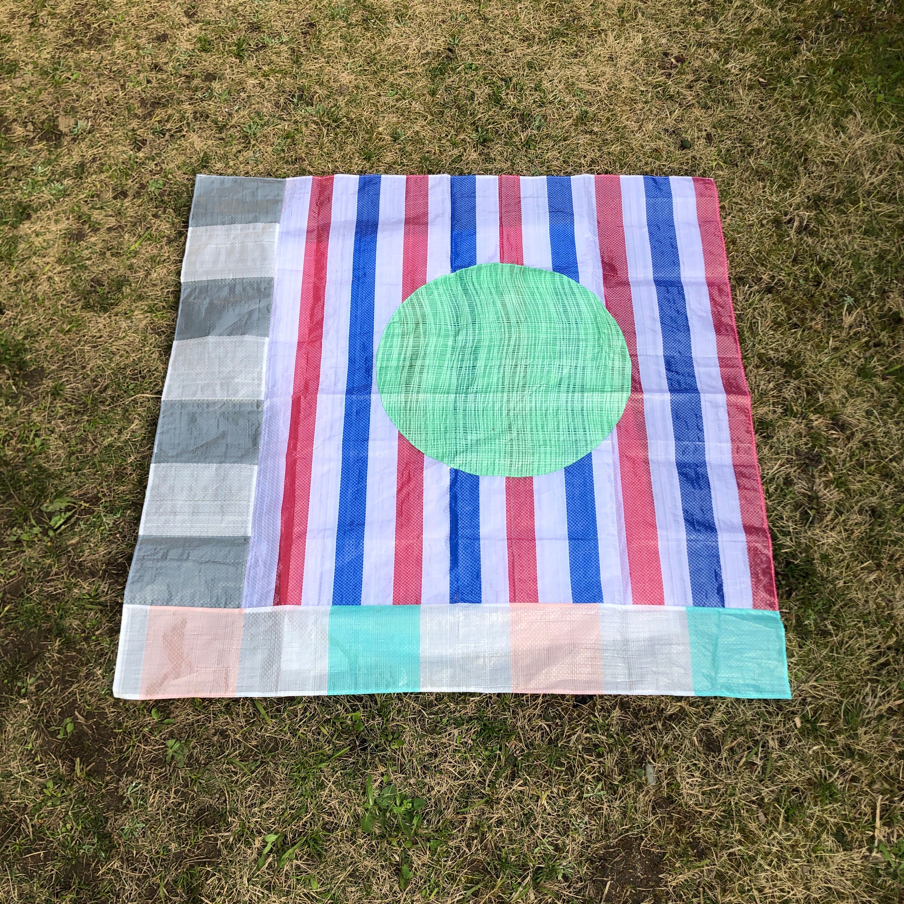 既製品のレジャーシートをランダムに裁断し、再構成して縫い合わせた「レジャーシートのコラージュ」。即興的に構成しているため模様やサイズなどは1点ずつ異なります。