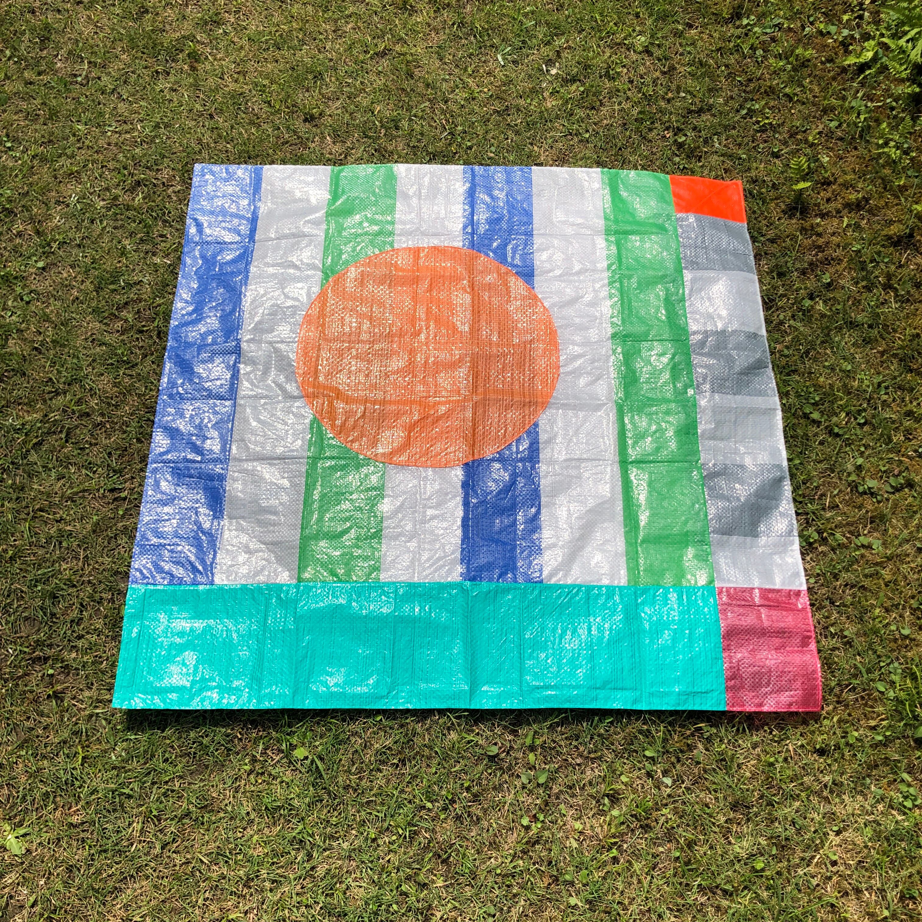既製品のレジャーシートをランダムに裁断し、再構成して縫い合わせた「レジャーシートのコラージュ」。即興的に構成しているため模様やサイズなどは1点ずつ異なります。