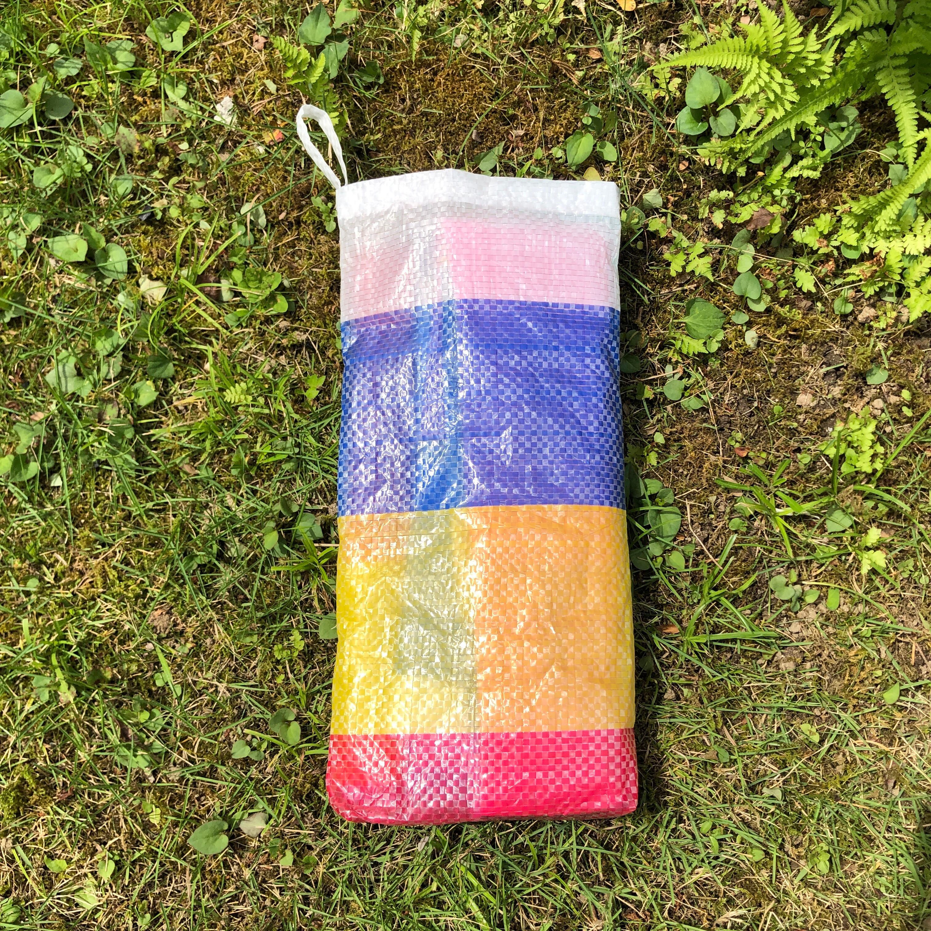既製品のレジャーシートをランダムに裁断し、再構成して縫い合わせた「レジャーシートのコラージュ」。即興的に構成しているため模様やサイズなどは1点ずつ異なります。
