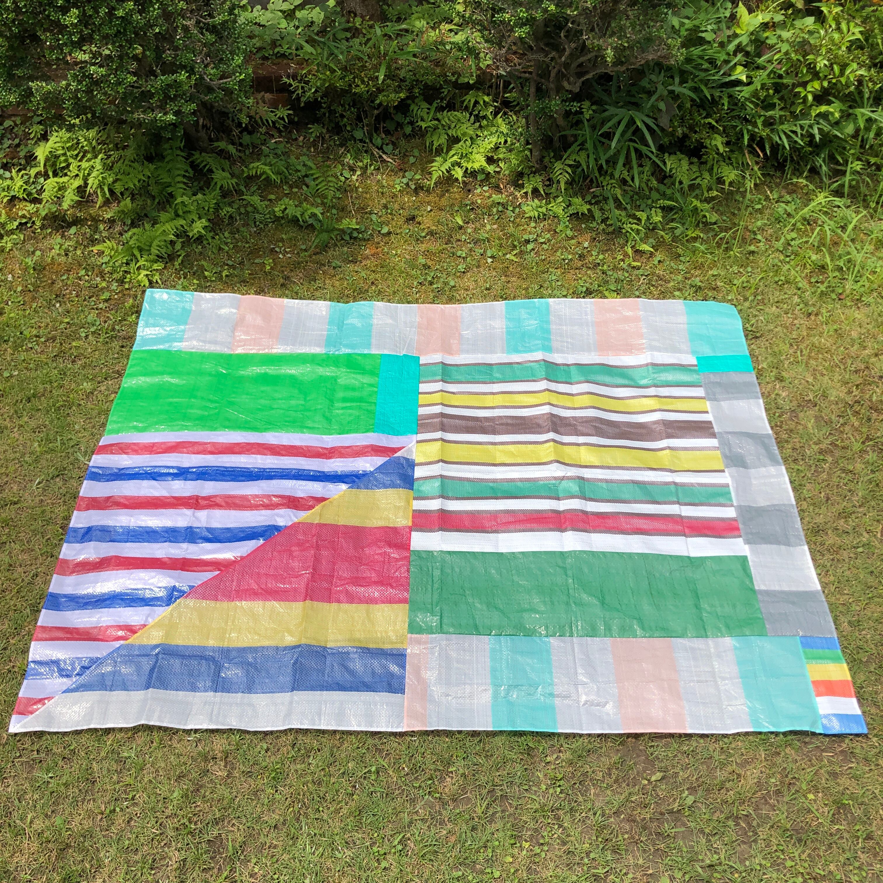 既製品のレジャーシートをランダムに裁断し、再構成して縫い合わせた「レジャーシートのコラージュ」。即興的に構成しているため模様やサイズなどは1点ずつ異なります。