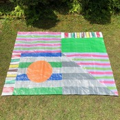 既製品のレジャーシートをランダムに裁断し、再構成して縫い合わせた「レジャーシートのコラージュ」。即興的に構成しているため模様やサイズなどは1点ずつ異なります。