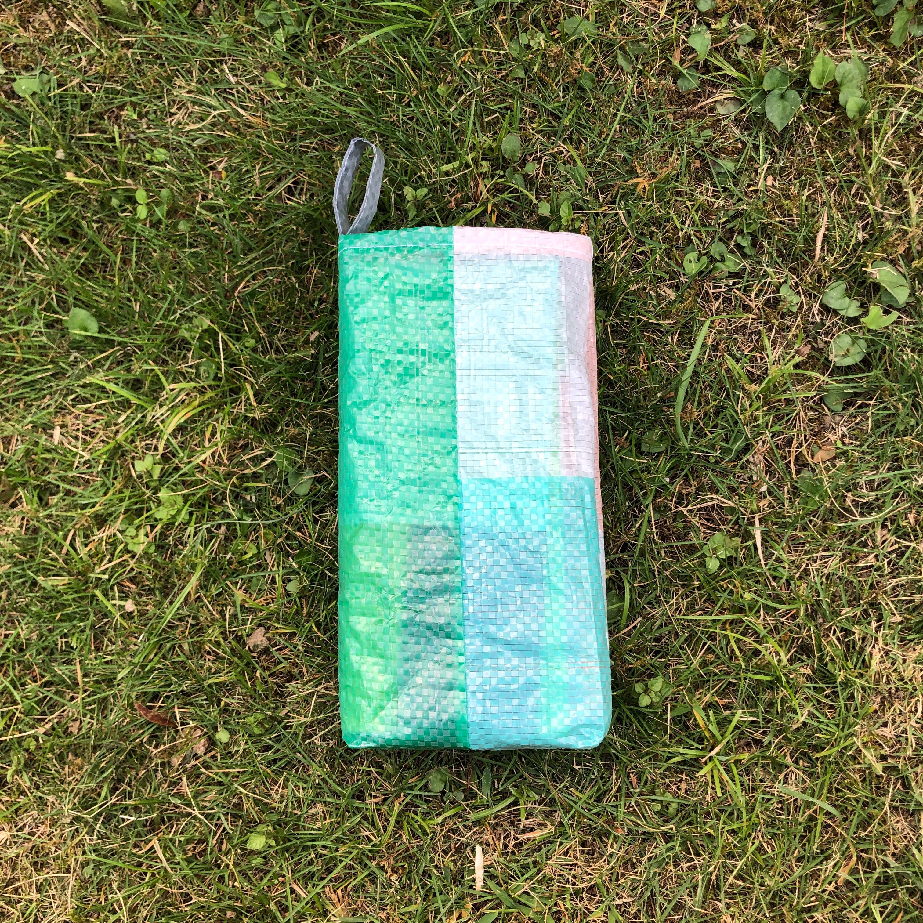 既製品のレジャーシートをランダムに裁断し、再構成して縫い合わせた「レジャーシートのコラージュ」。即興的に構成しているため模様やサイズなどは1点ずつ異なります。