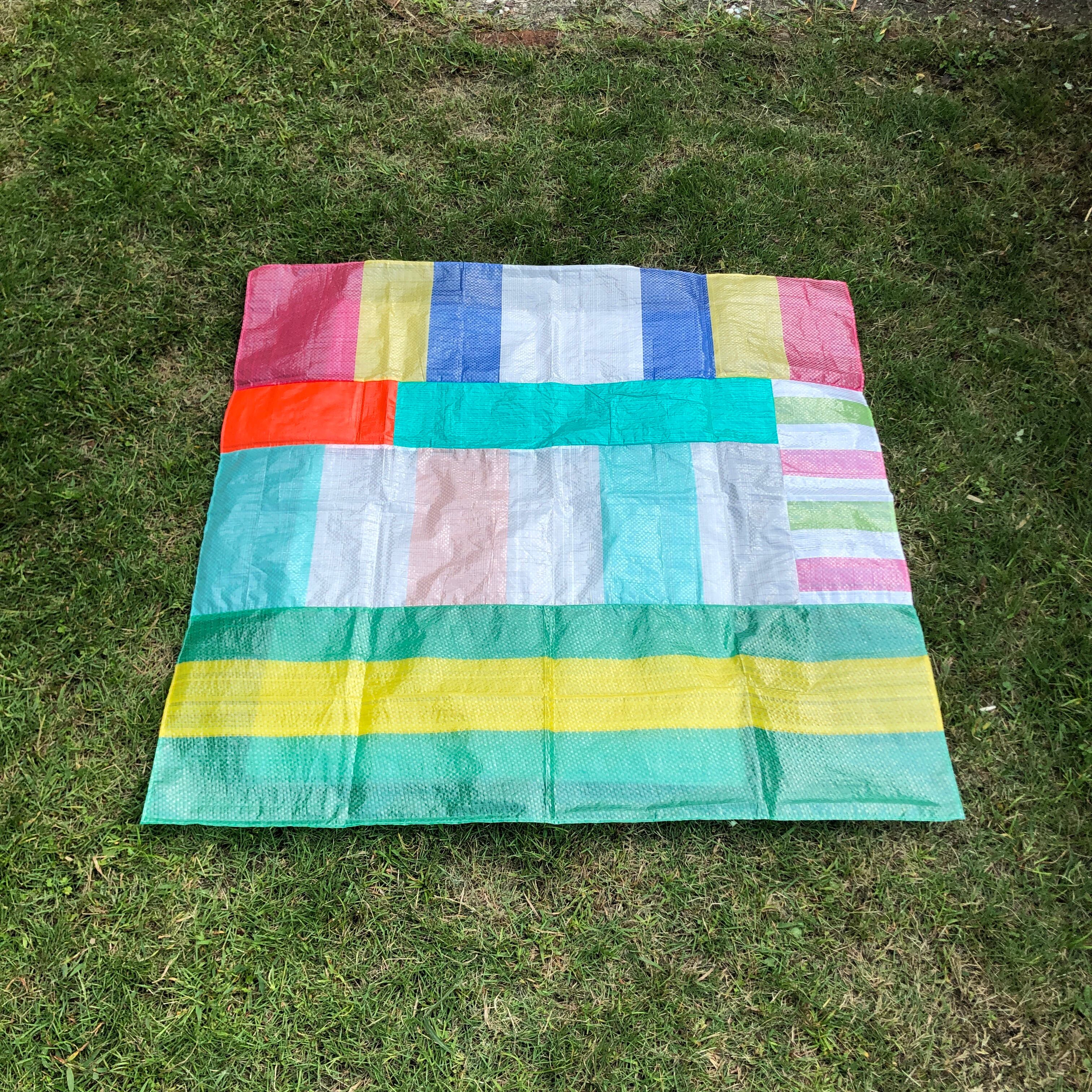 既製品のレジャーシートをランダムに裁断し、再構成して縫い合わせた「レジャーシートのコラージュ」。即興的に構成しているため模様やサイズなどは1点ずつ異なります。