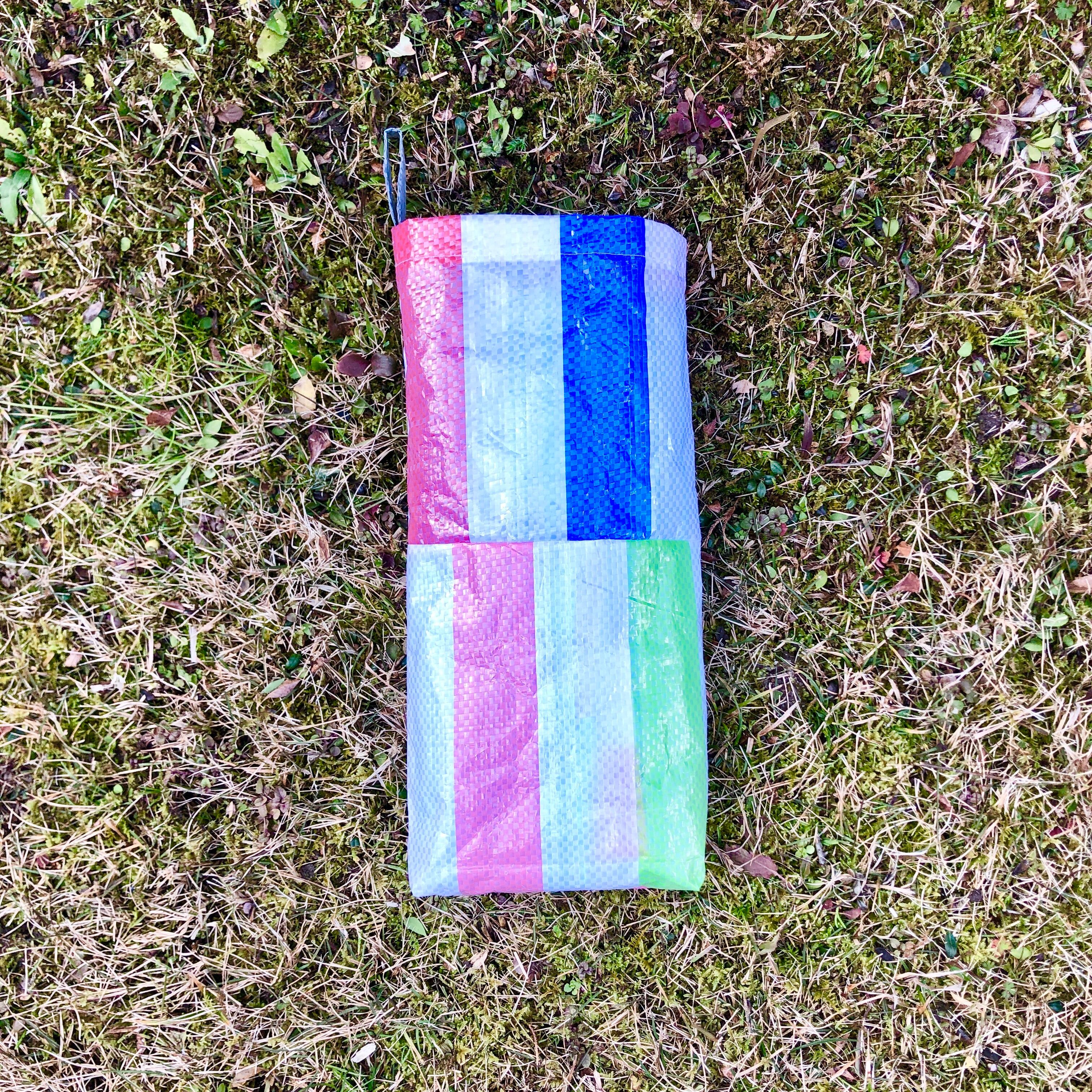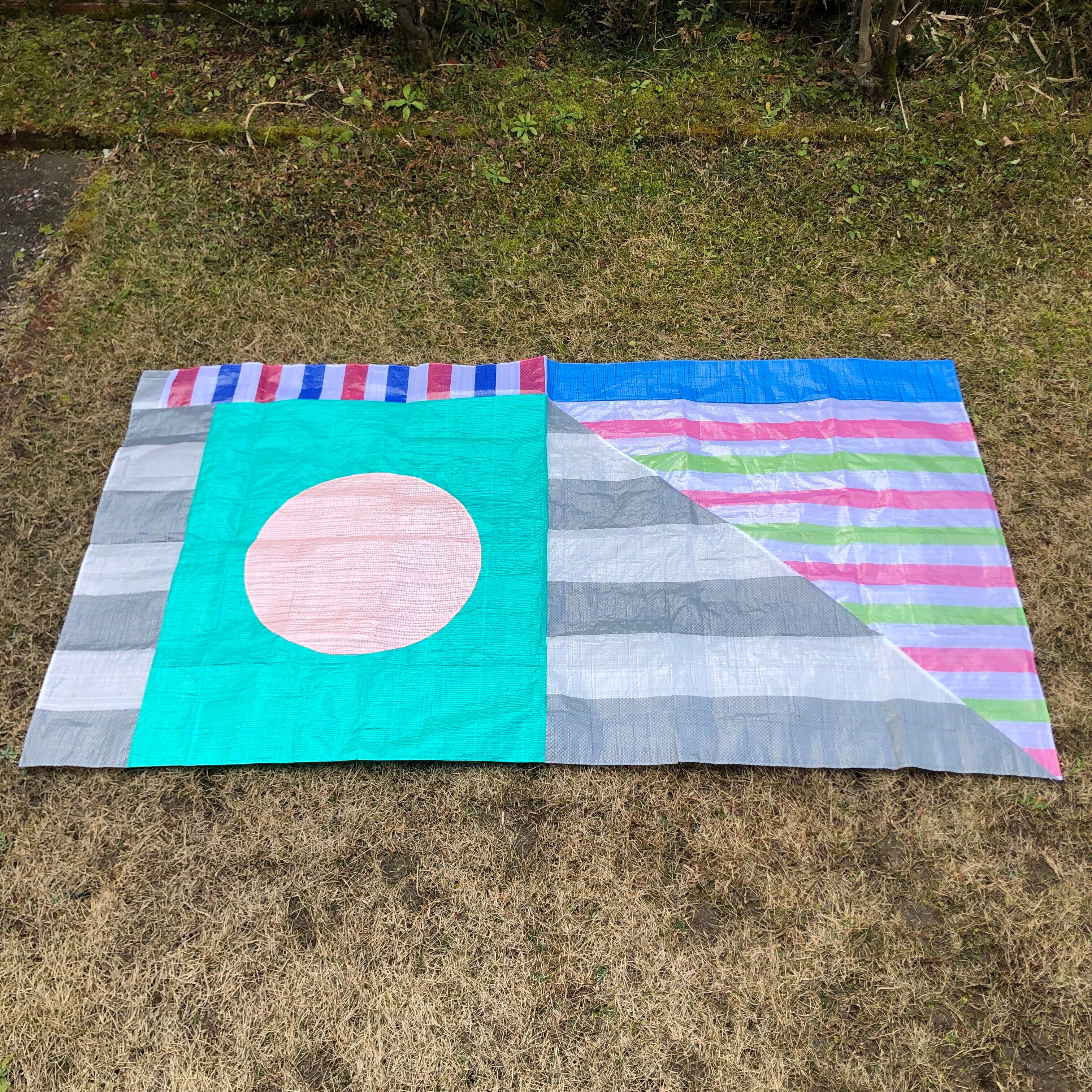 既製品のレジャーシートをランダムに裁断し、再構成して縫い合わせた「レジャーシートのコラージュ」。即興的に構成しているため模様やサイズなどは1点ずつ異なります。
