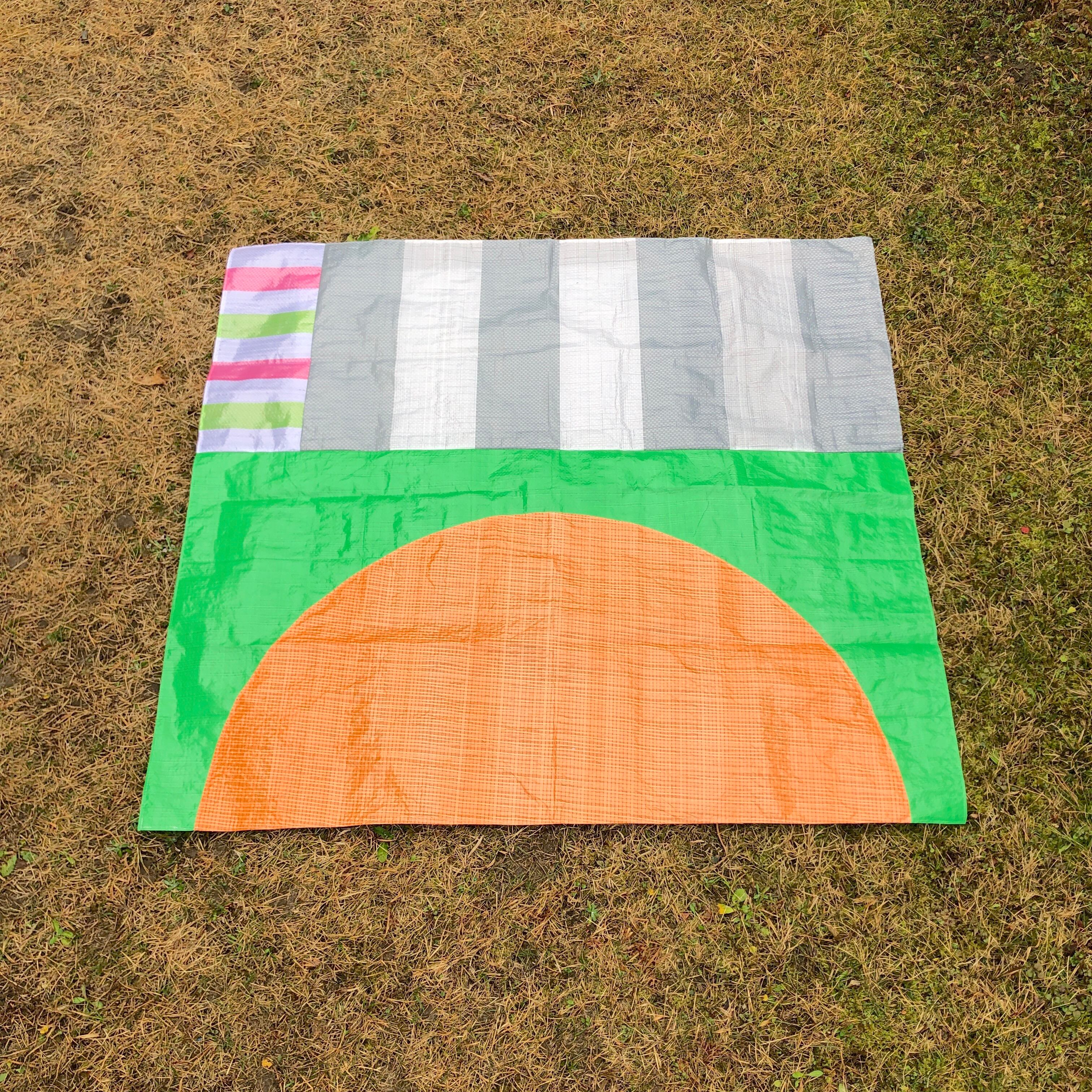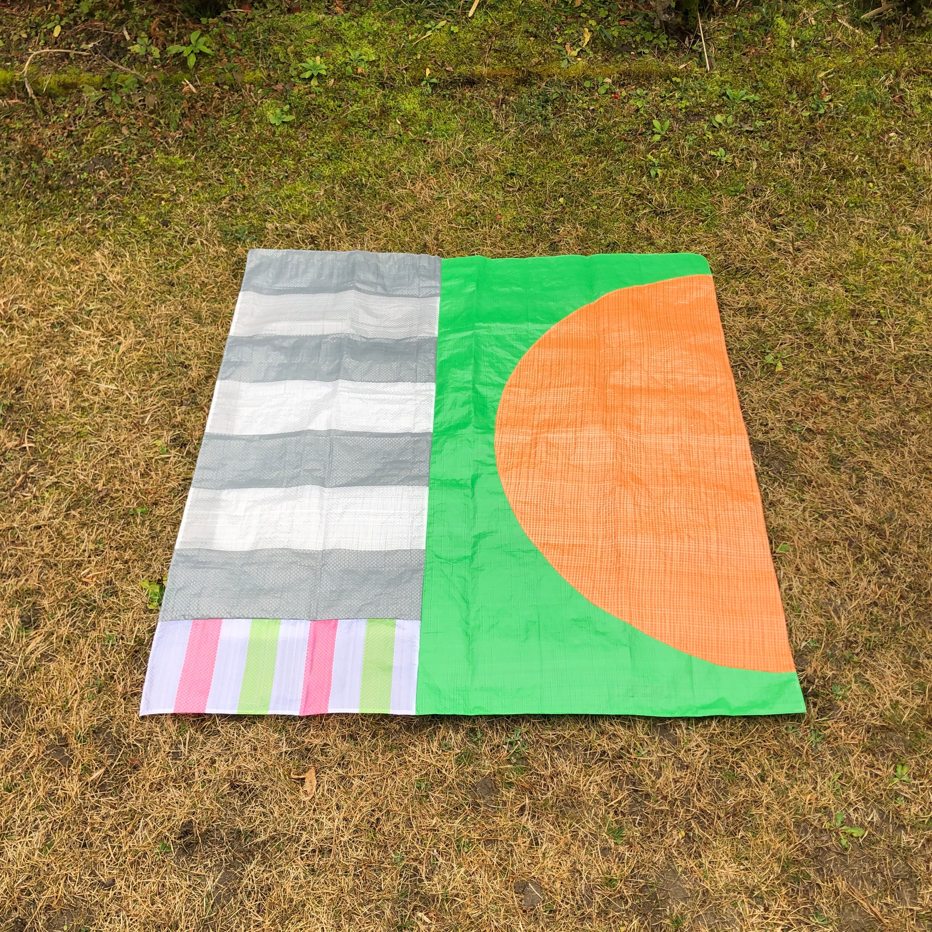 既製品のレジャーシートをランダムに裁断し、再構成して縫い合わせた「レジャーシートのコラージュ」。即興的に構成しているため模様やサイズなどは1点ずつ異なります。