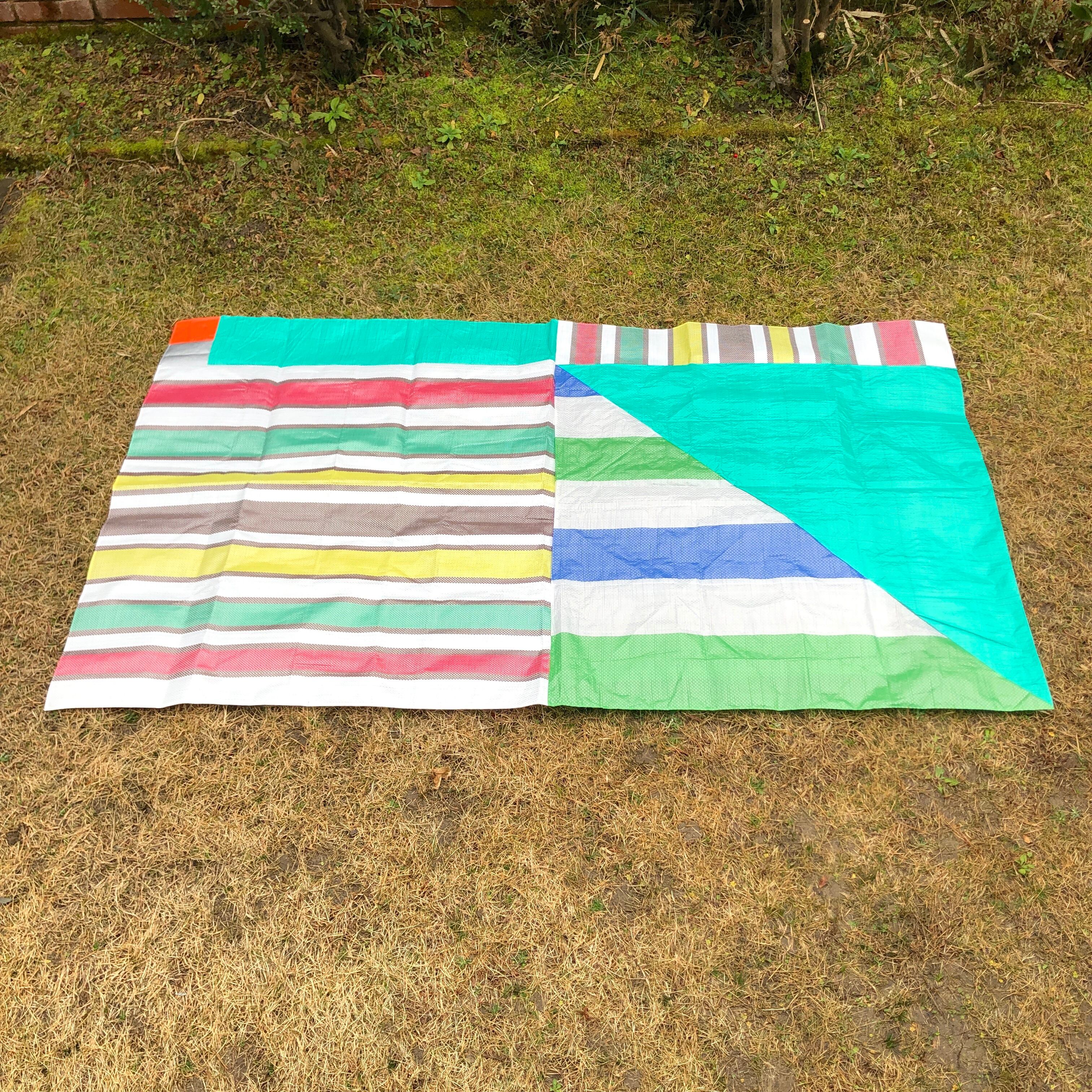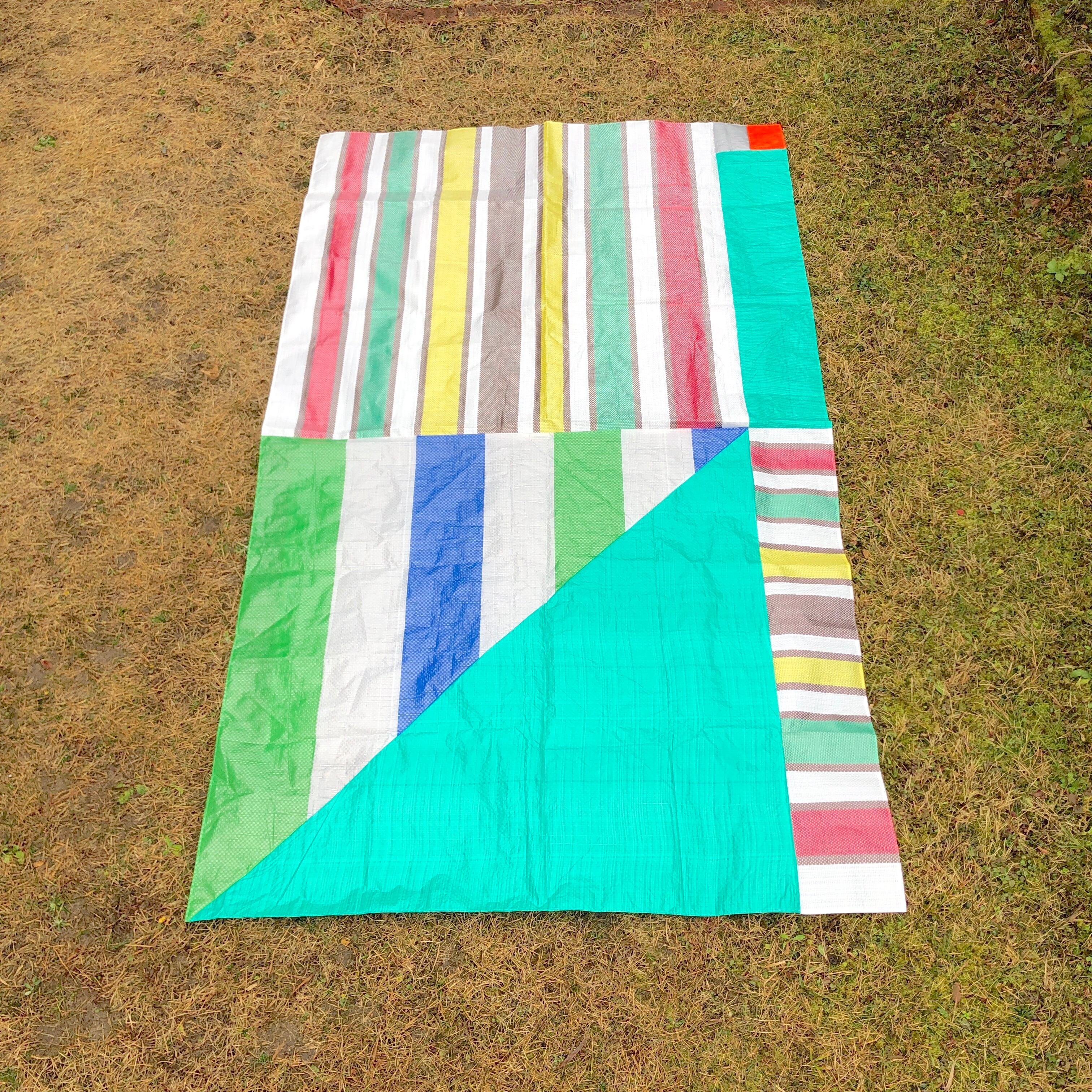既製品のレジャーシートをランダムに裁断し、再構成して縫い合わせた「レジャーシートのコラージュ」。即興的に構成しているため模様やサイズなどは1点ずつ異なります。