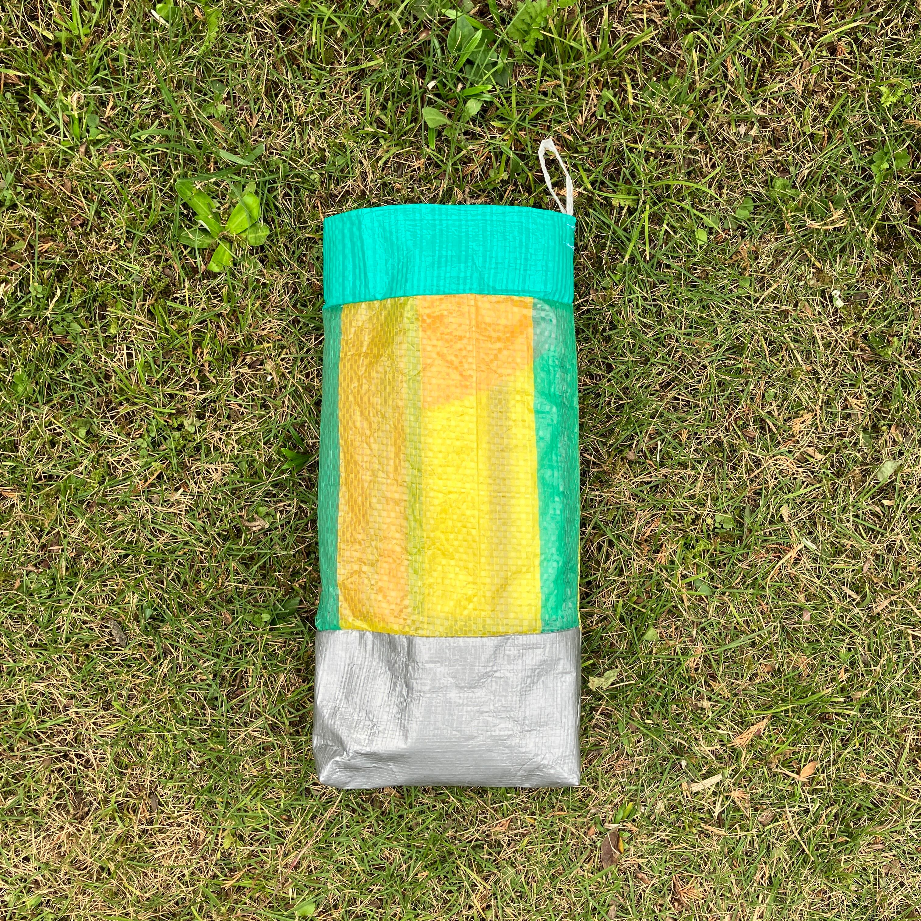 既製品のレジャーシートをランダムに裁断し、再構成して縫い合わせた「レジャーシートのコラージュ」。即興的に構成しているため模様やサイズなどは1点ずつ異なります。