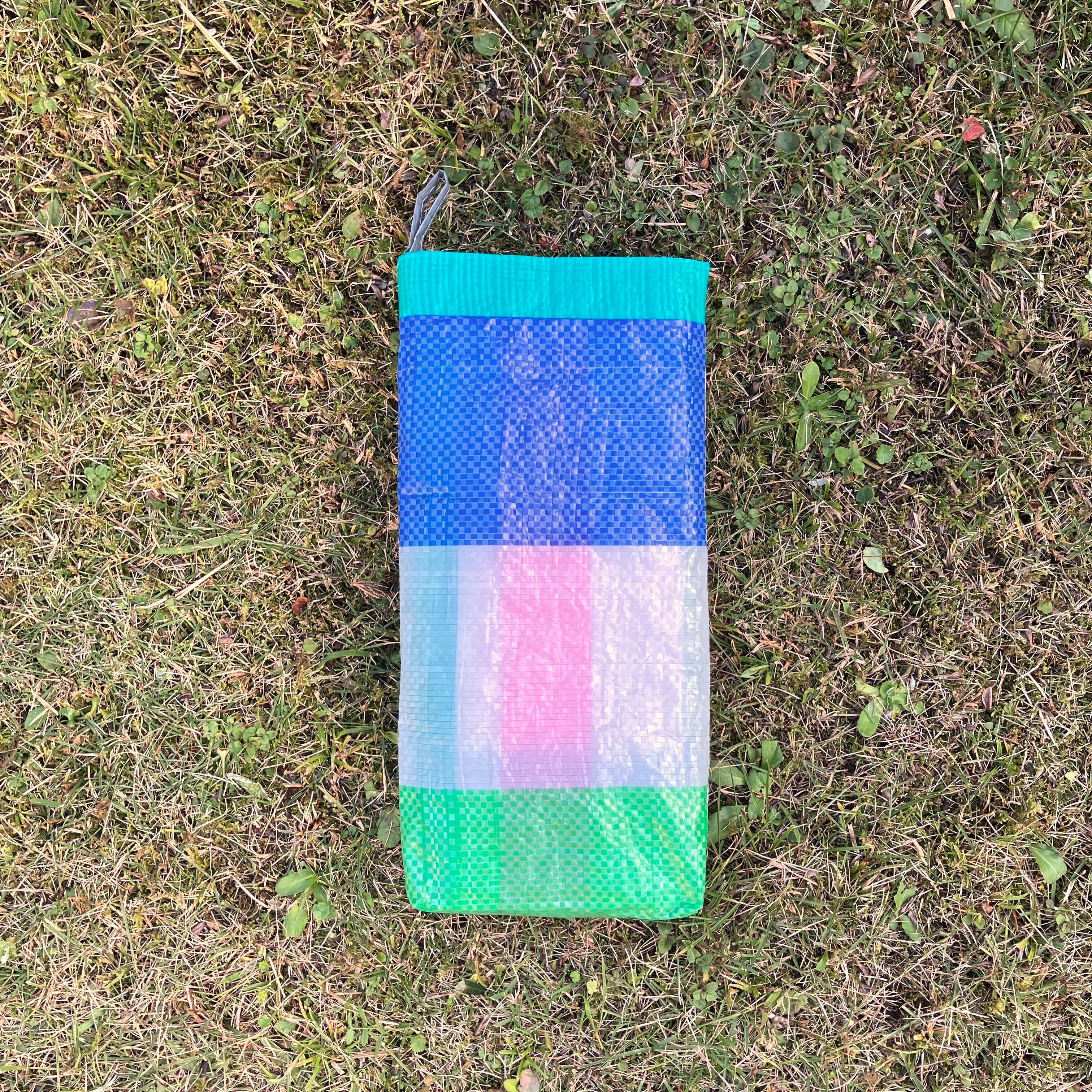 既製品のレジャーシートをランダムに裁断し、再構成して縫い合わせた「レジャーシートのコラージュ」。即興的に構成しているため模様やサイズなどは1点ずつ異なります。